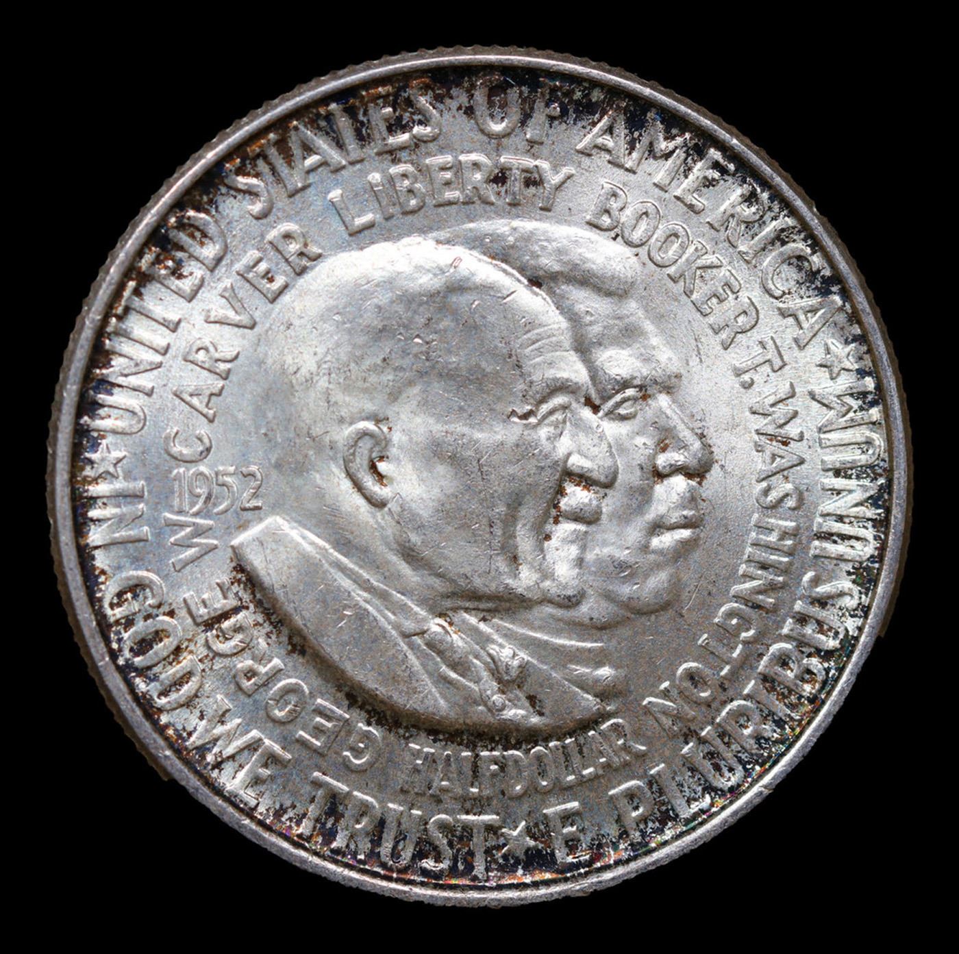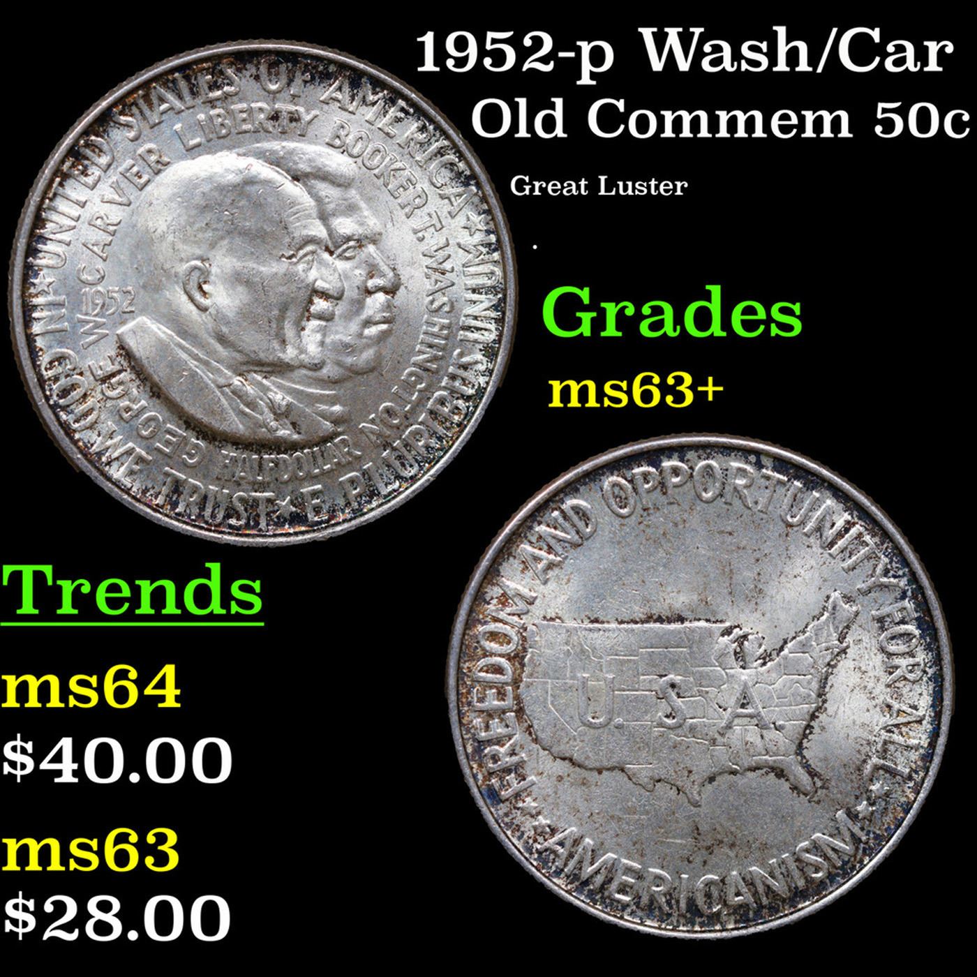 1952-p Wash/Car Old Commem Half Dollar 50c Grades Select+ Unc. The Final Coin in the Old Commemorative Program. It was Minted to Revive the Ending Booker T Washington Commemorative and to Honor Washington Carver. When examining a Wash/Carver examine the High Points, which are Carver's cheek on the Obverse and the Center of the USA on the Reverse.