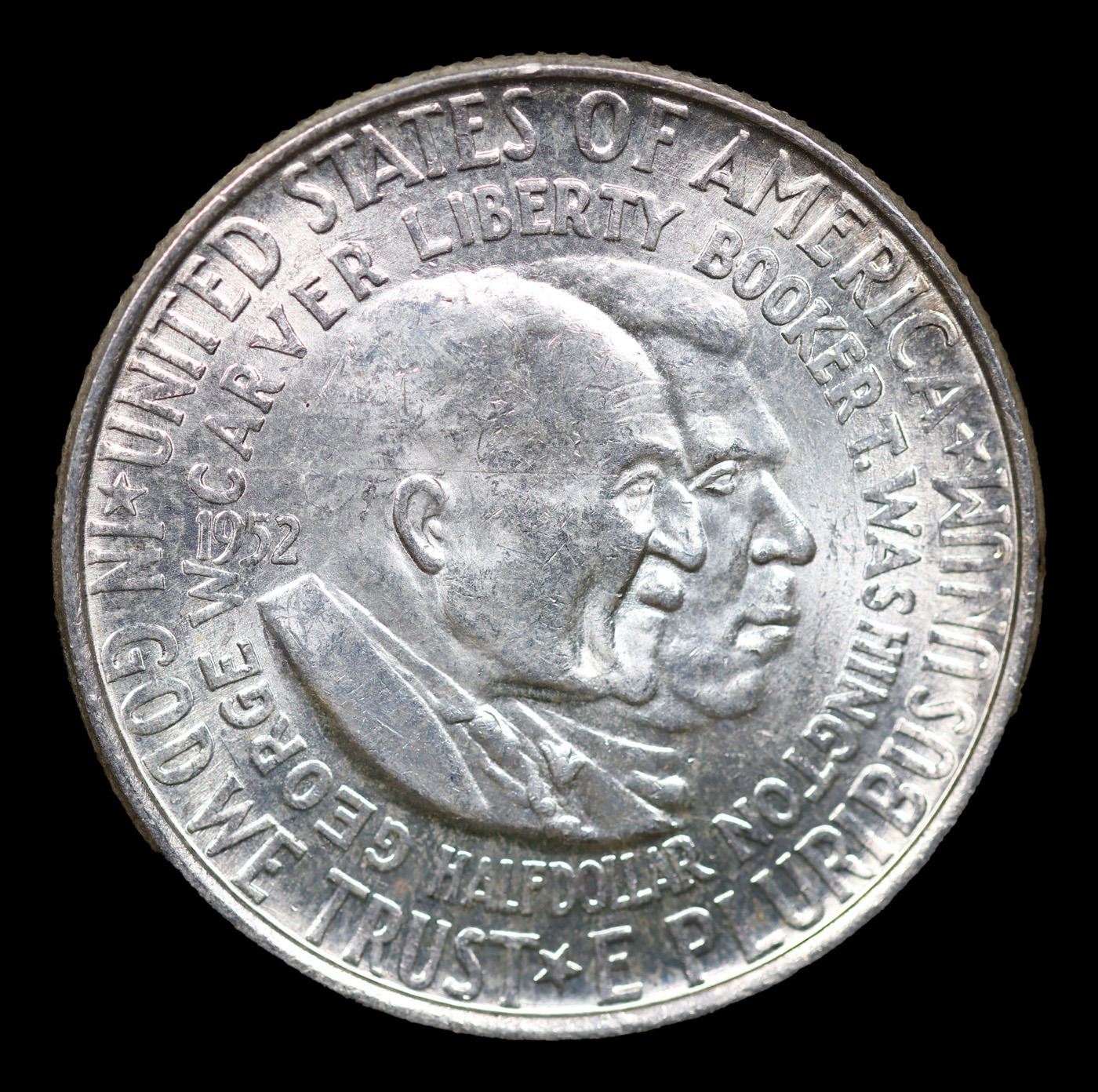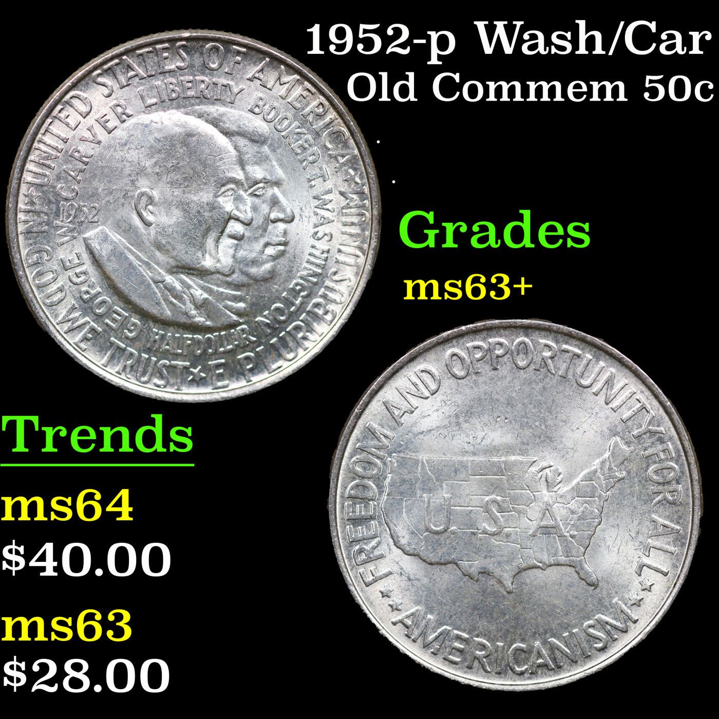 1952-p Wash/Car Old Commem Half Dollar 50c Grades Select+ Unc. The Final Coin in the Old Commemorative Program. It was Minted to Revive the Ending Booker T Washington Commemorative and to Honor Washington Carver. When examining a Wash/Carver examine the High Points, which are Carver's cheek on the Obverse and the Center of the USA on the Reverse.