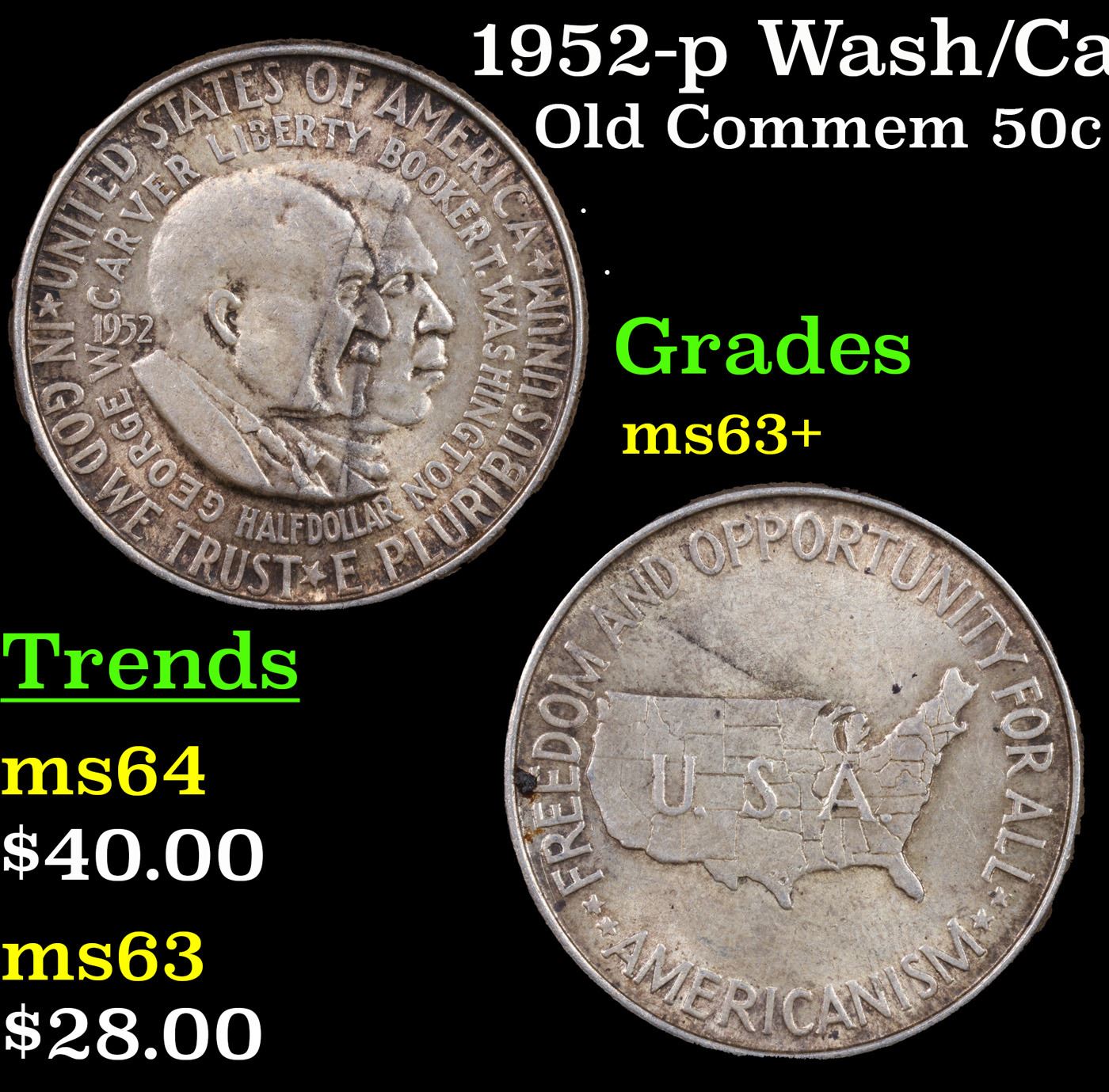 1952-p Wash/Car Old Commem Half Dollar 50c Grades Select+ Unc. The Final Coin in the Old Commemorative Program. It was Minted to Revive the Ending Booker T Washington Commemorative and to Honor Washington Carver. When examining a Wash/Carver examine the High Points, which are Carver's cheek on the Obverse and the Center of the USA on the Reverse.