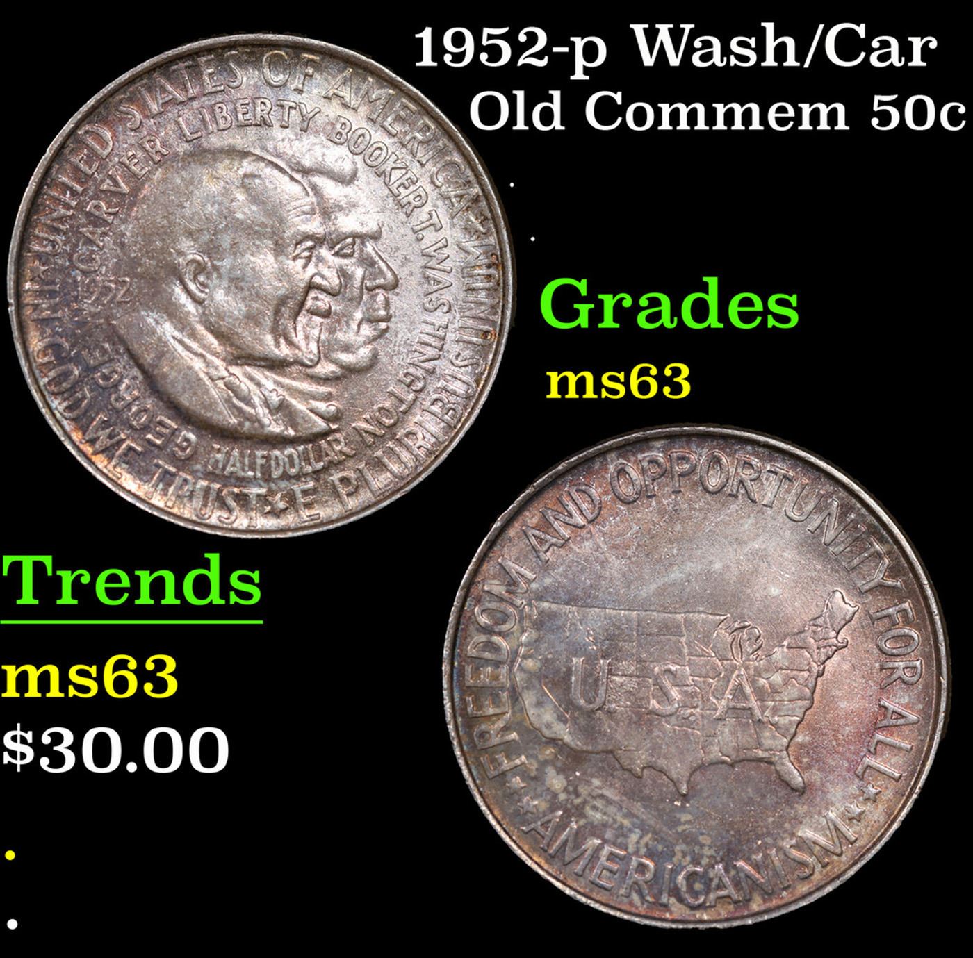 1952-p Wash/Car Old Commem Half Dollar 50c Grades Select Unc. The Final Coin in the Old Commemorative Program. It was Minted to Revive the Ending Booker T Washington Commemorative and to Honor Washington Carver. When examining a Wash/Carver examine the High Points, which are Carver's cheek on the Obverse and the Center of the USA on the Reverse.