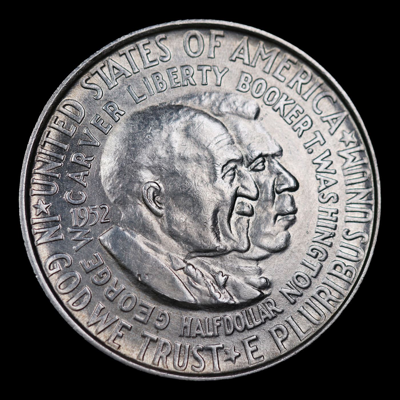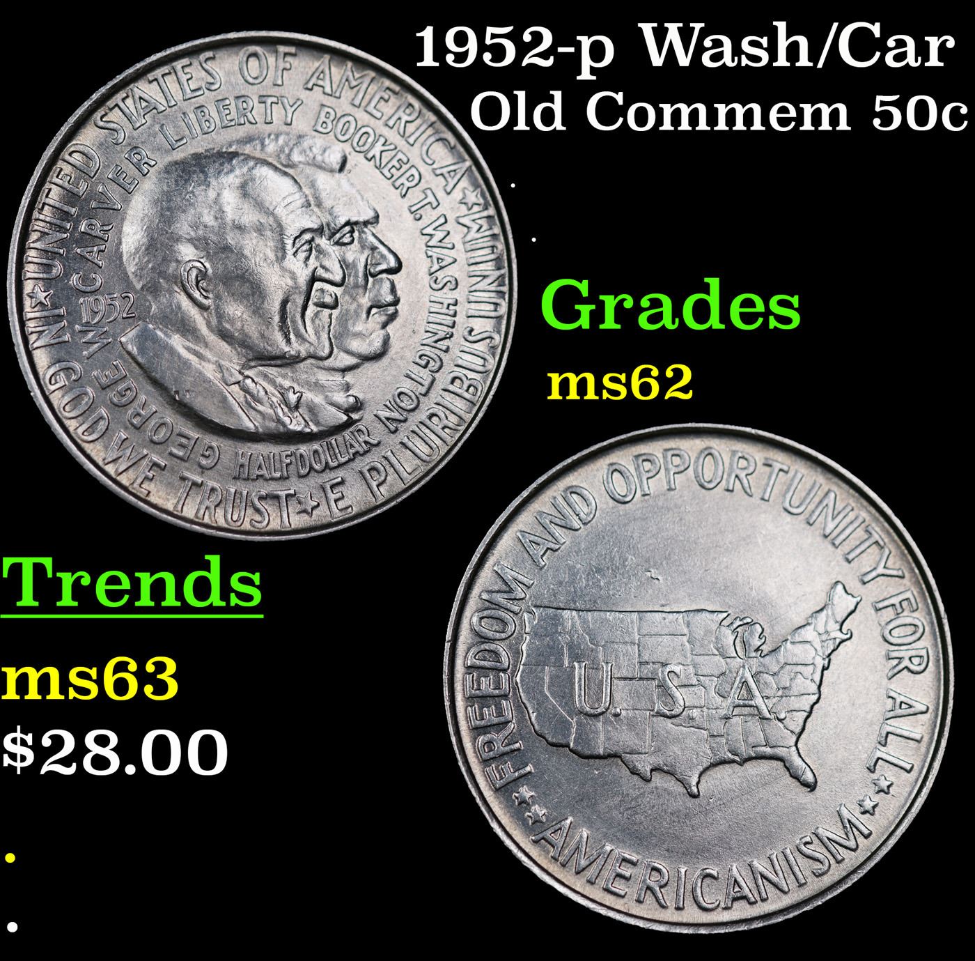 1952-p Wash/Car Old Commem Half Dollar 50c Grades Select Unc. The Final Coin in the Old Commemorative Program. It was Minted to Revive the Ending Booker T Washington Commemorative and to Honor Washington Carver. When examining a Wash/Carver examine the High Points, which are Carver's cheek on the Obverse and the Center of the USA on the Reverse.