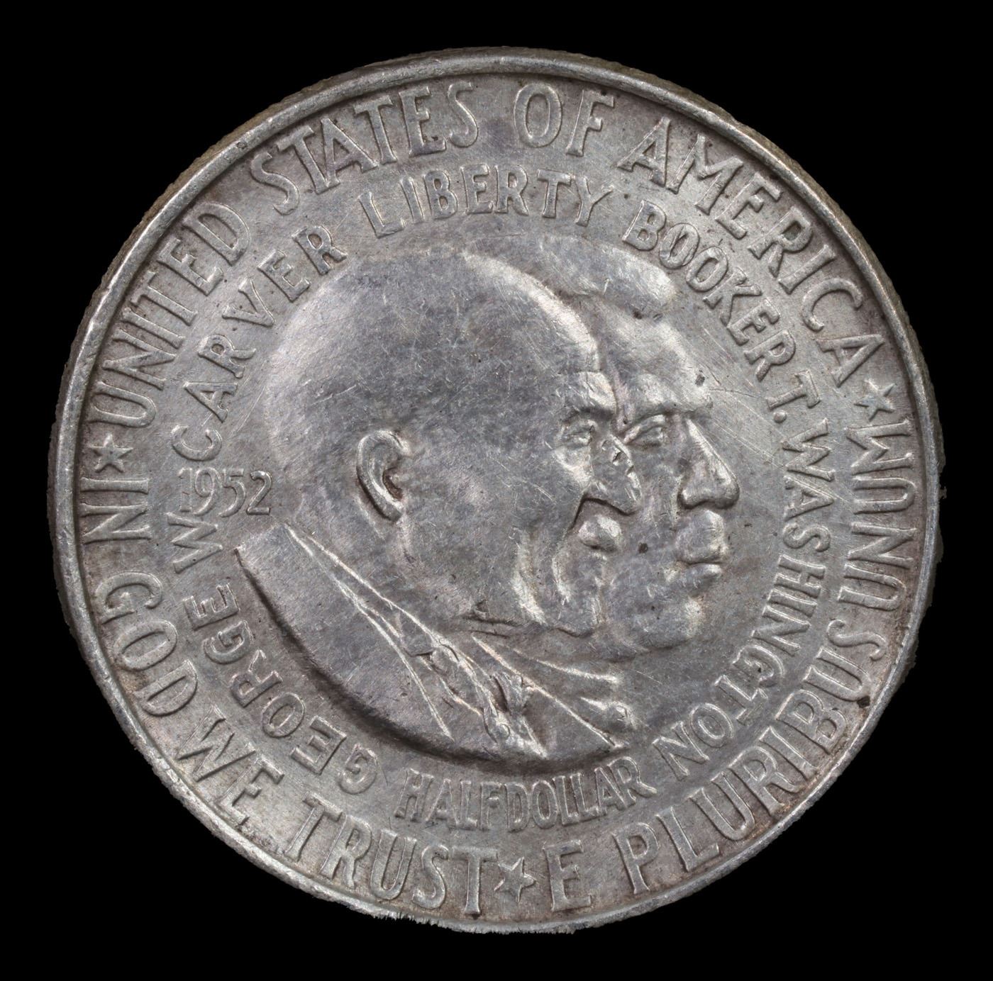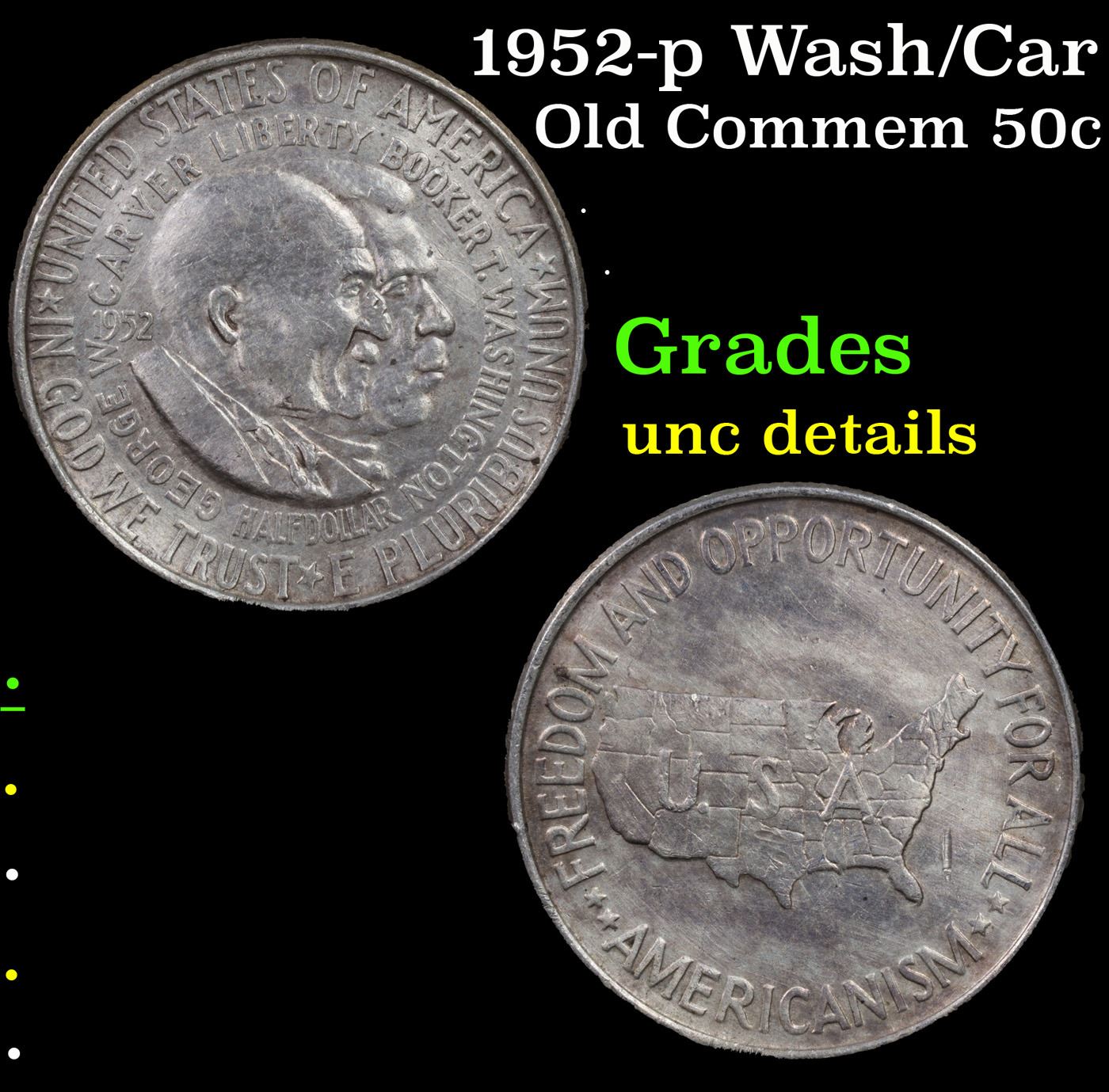 1952-p Wash/Car Old Commem Half Dollar 50c Grades Unc Details. The Final Coin in the Old Commemorative Program. It was Minted to Revive the Ending Booker T Washington Commemorative and to Honor Washington Carver. When examining a Wash/Carver examine the High Points, which are Carver's cheek on the Obverse and the Center of the USA on the Reverse.
