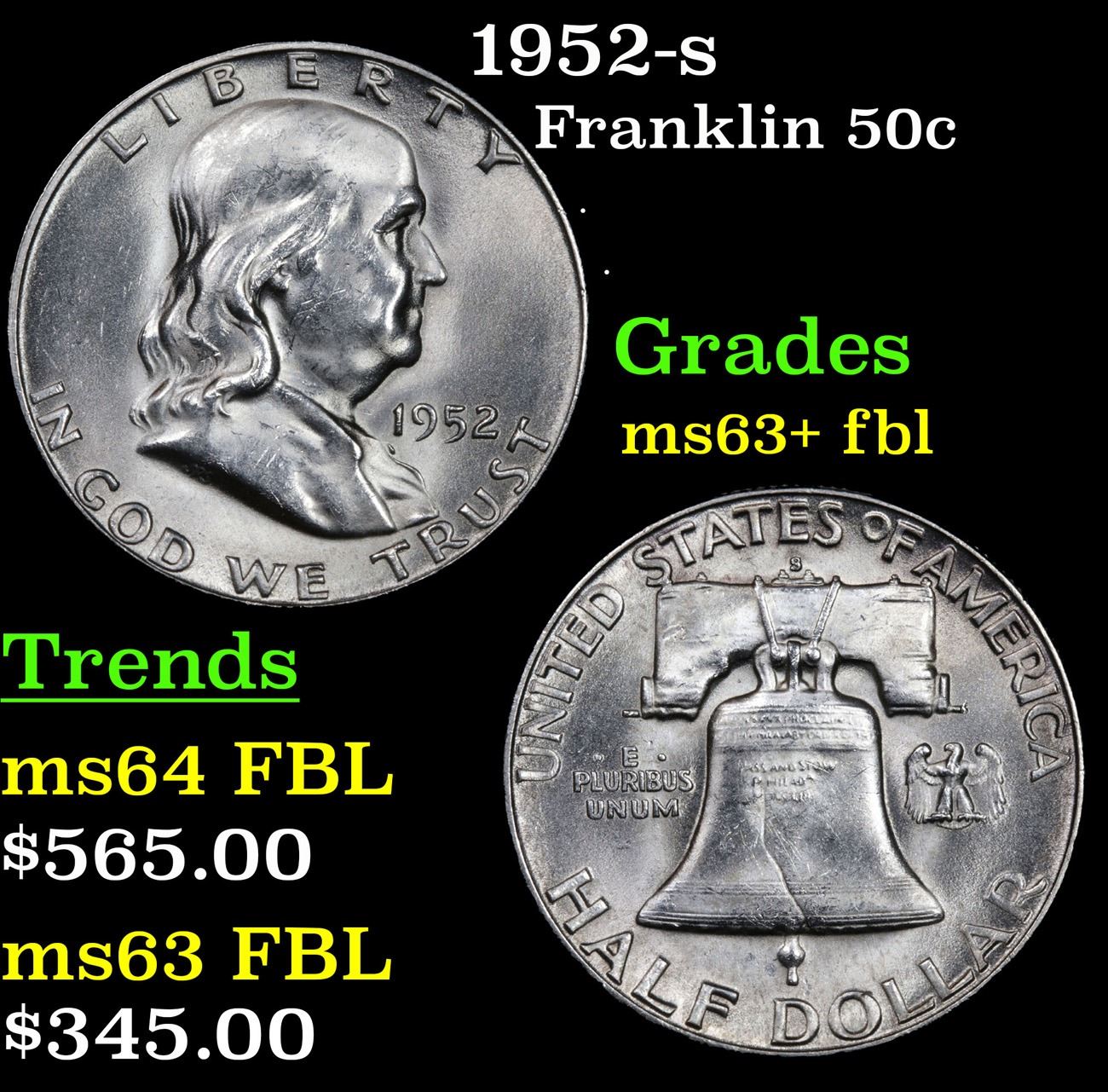 1952-s . . Franklin Half Dollar 50c Grades Select Unc+ FBL.