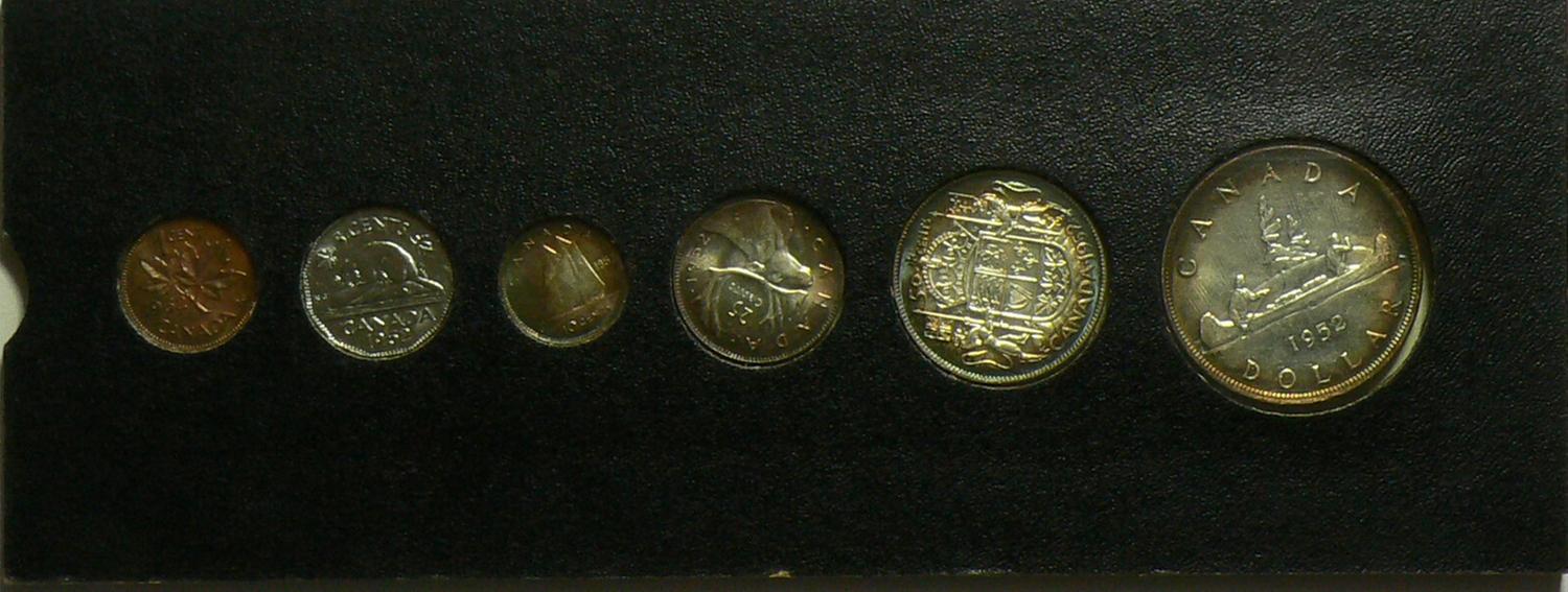 1952, year set in black cardboard, coins are UNC, 25 cents is HR.
