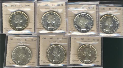 1953 $1. Lot of 7 ICCS certified examples in MS62 Cameo. 5 x NSF and 2 x SF