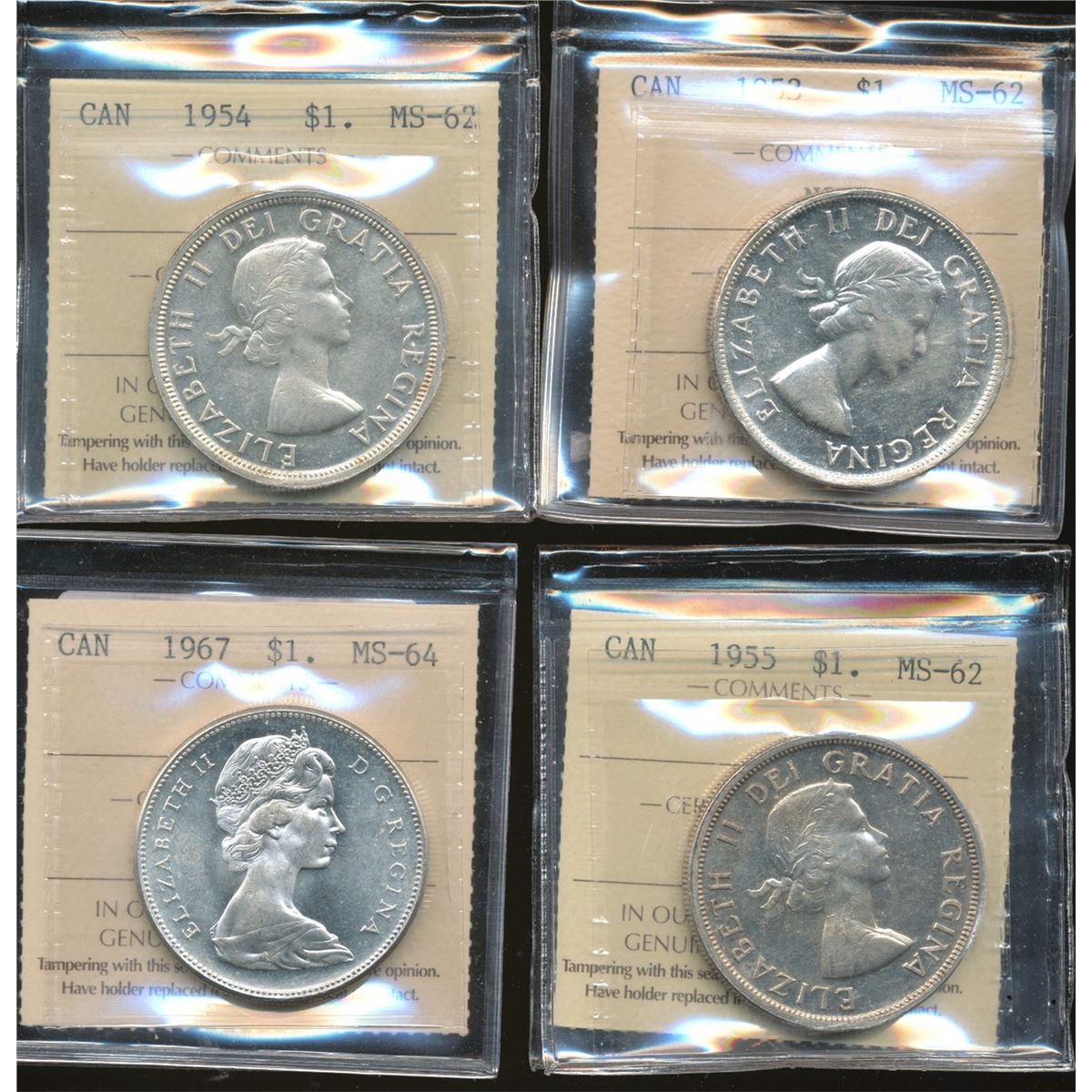 1953 $1 NSF, 1954, 1955 MS62 & 1967 MS64. Lot of 4 coins all ICCS graded.