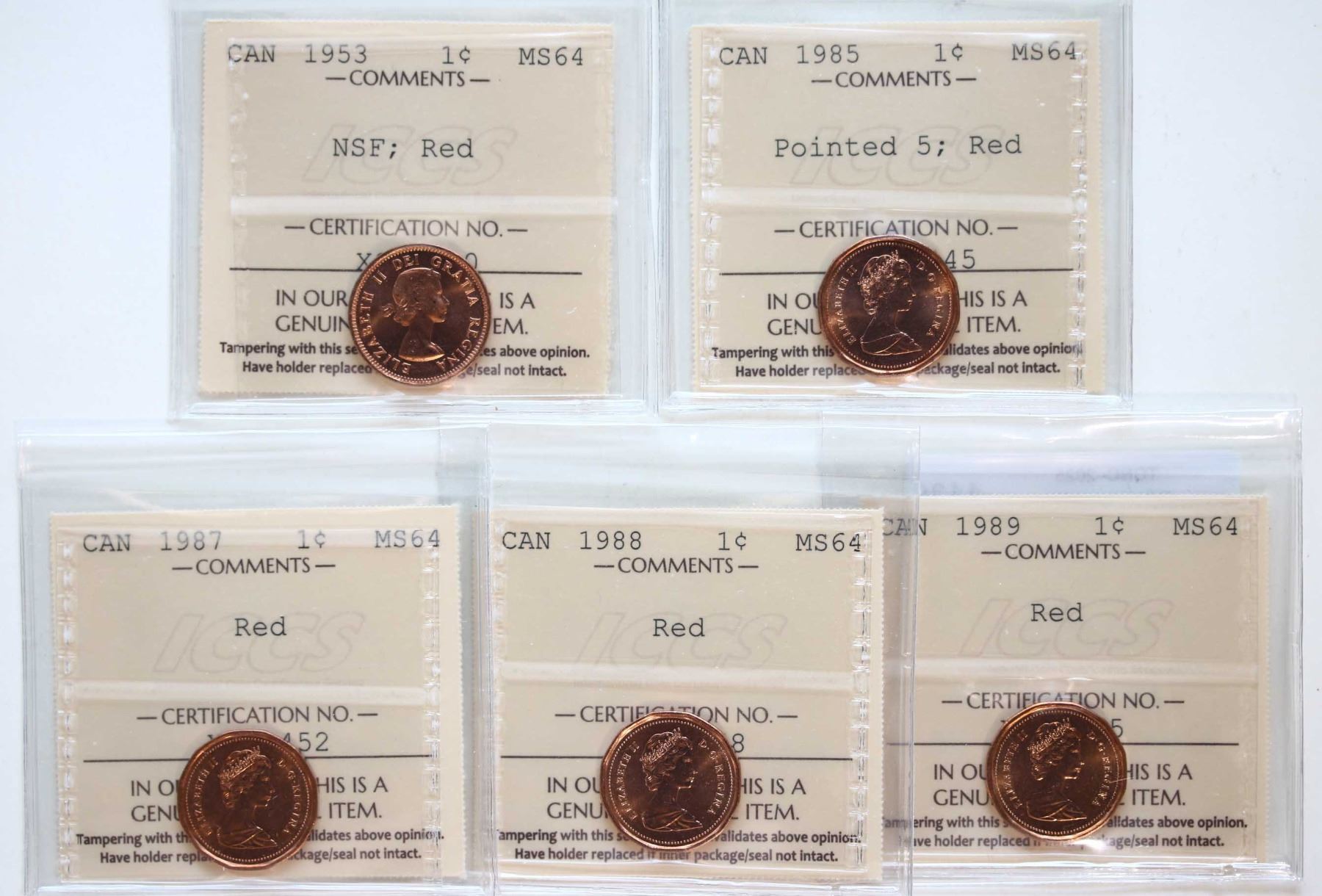 1953 1¢ "NSF", 1985 "Pointed 5", 1987, 1988, 1989 Lot of 5 coins ICCS Choice Mint State-64 Red.