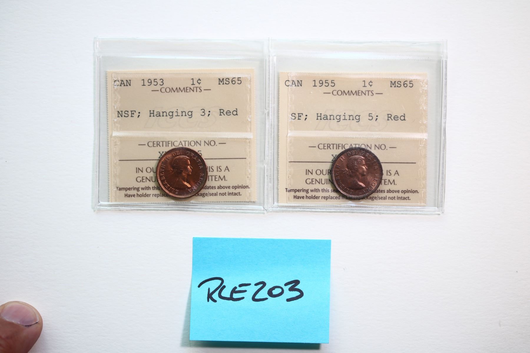 1953 1¢ "NSF - Hanging 3", 1955 "SF - Hanging 5" Both coins ICCS Gem Mint State-65 Red