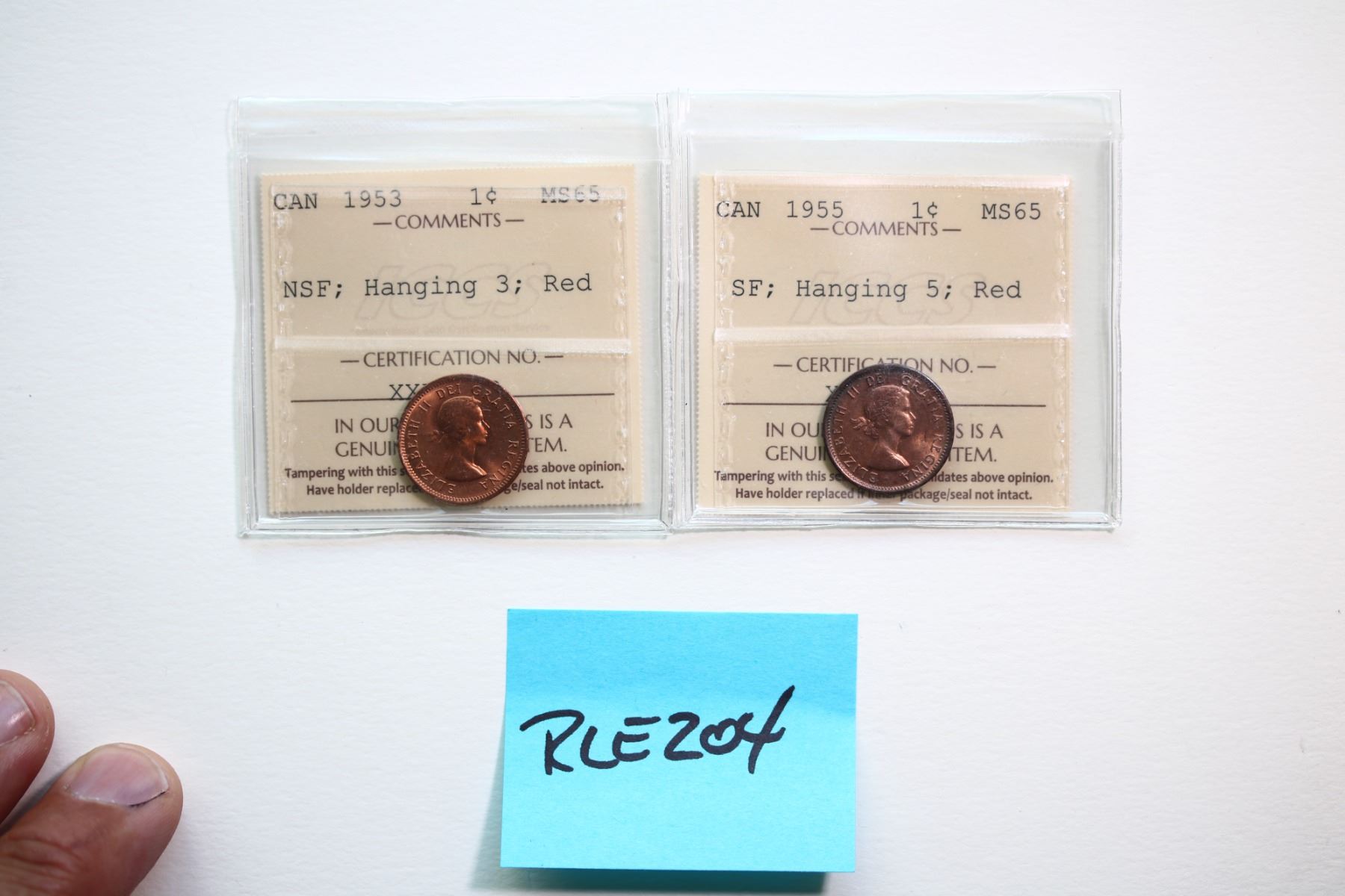 1953 1¢  NSF - Hanging 3 , 1955  SF - Hanging 5  Both coins ICCS Gem Mint State-65 Red