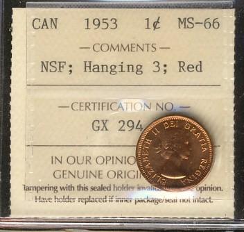1953 1¢ NSF Hanging 3 ICCS MS66RD.