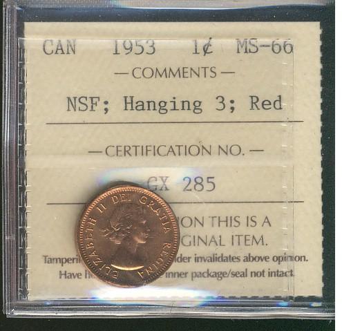 1953 1¢ NSF Hanging 3 ICCS MS66RD.