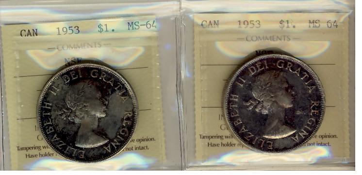 1953 $1 NSF ICCS MS64. Lot of 2 coins.