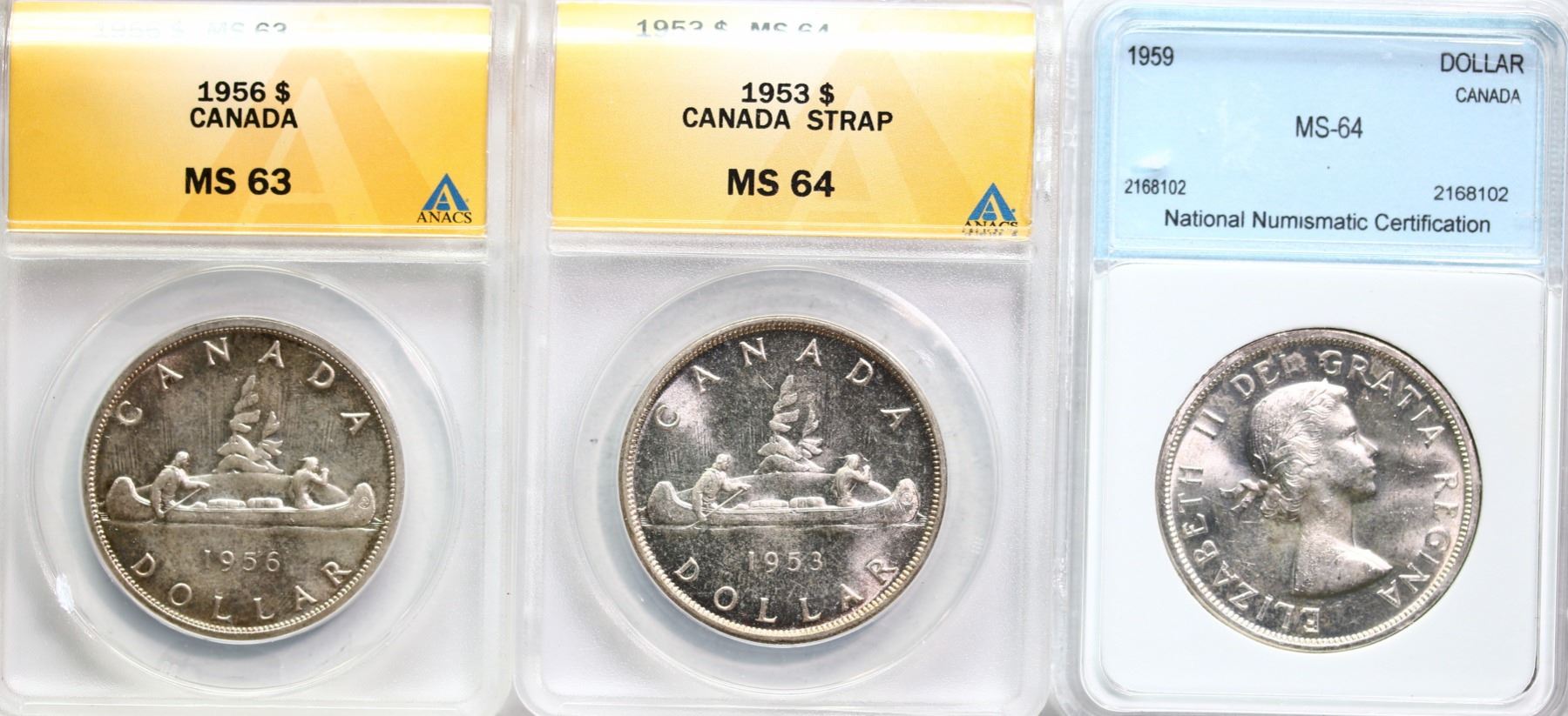 1953 $1 "SF", 1956, 1959, Lot of 3 certified coins Choice Mint State-63 to Very Choice Mint State-64
