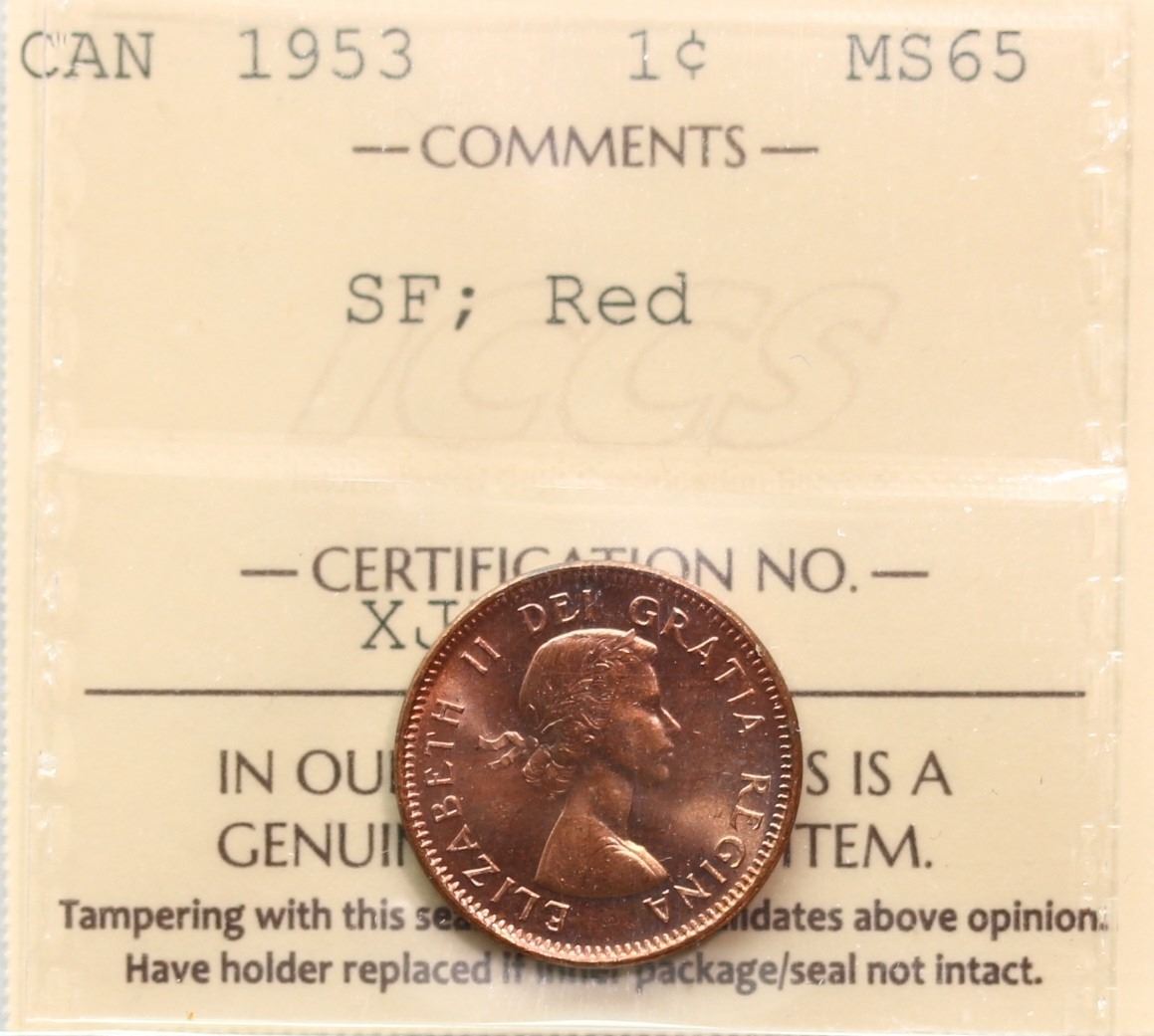 1953 1¢ SF ICCS Gem Mint State-65RED. A beauty! Among the best examples seen! Very scarce in top condition and rarely offered. Don't miss your opportunity to acquire this underrated variety. Expect spirited bidding.