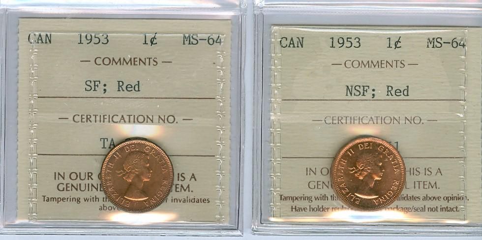 1953 1¢ SF & NSF ICCS MS64. Lot of 2 coins both Red.