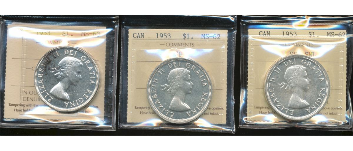 1953 $1 SF, NSF & SF SWL ICCS MS62 to MS63. Lot of 3 coins