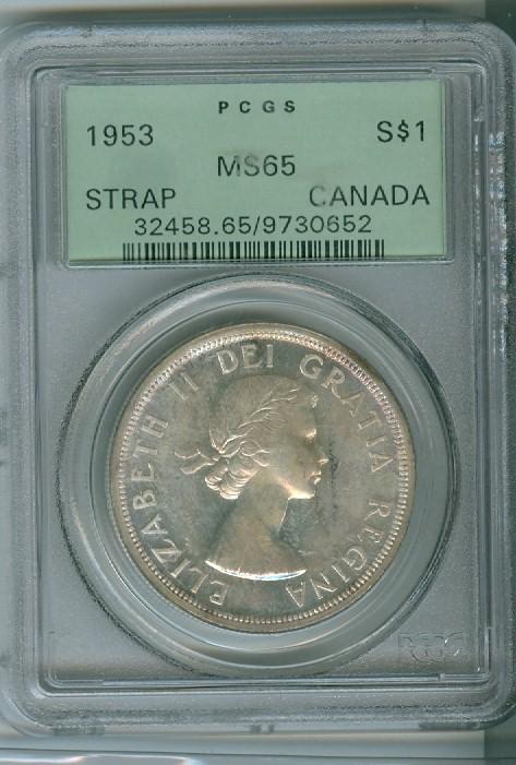 1953 $1 SF PCGS MS65. Lustrous coin in old green holder.
