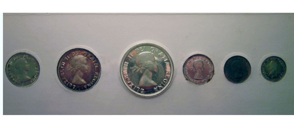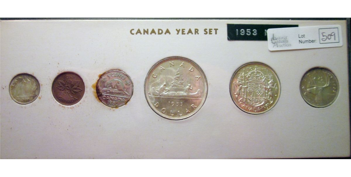 1953; 1 cent MS-63 NSF Brown, 5 cents MS-64 NSF Far Corrosion, 10 cents MS-63 NSF, 25 cents MS-63 NSF Small Date, 50 cents MS-60 NSF Small Date & dollar MS-60 NSF in a white cardboard.