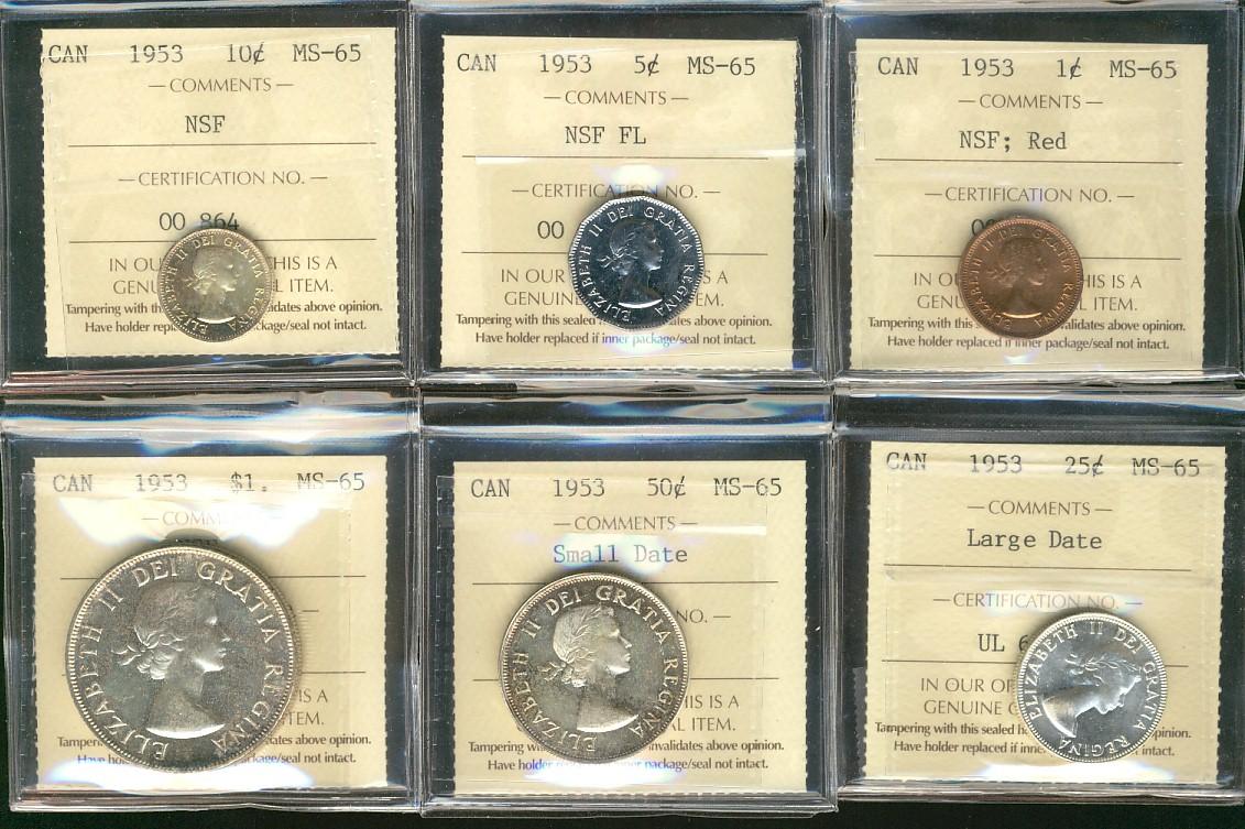 1953 1¢ to 1953 $1 Year set all ICCS MS65. A rare Gem set includes 1¢, 5$ 10¢ NSF, 25¢ LgDt, 50¢ Sml Dt & $1 NSF.