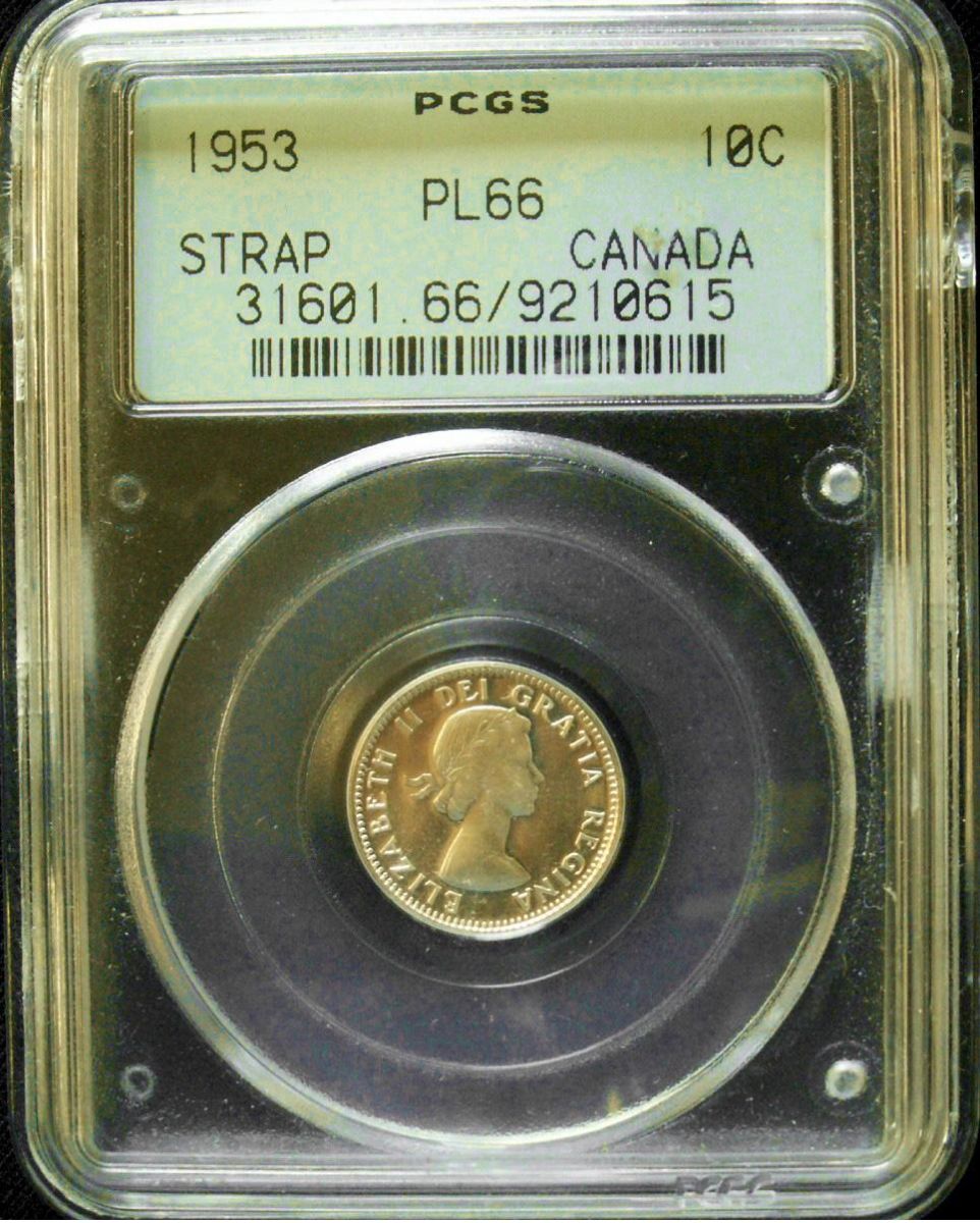 1953 10¢ SF PCGS PL66. Shows Heavy to Ultra Heavy Cameo finish. Only 9 examples finer.