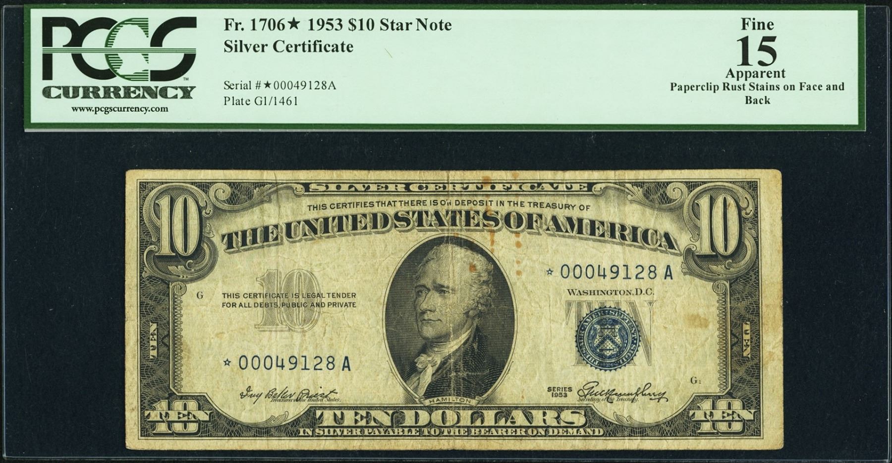 One 1953 $10 Silver Certificate STAR Note PCGS 15.