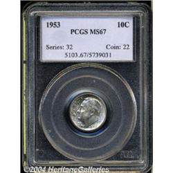 <B>1953<10C> MS67 PCGS.</B></I> Speckled olive and aqua toning cover lustrous, well preserved surfaces. The design features are adequately struck. Population: 25 in 67, 0 finer (3/04). <BR><BR><B>Important notice:</B> Heritage usually auctions material at the rate of 200-250 lots per hour. On some occasions eBay Live bid software or the Internet may not be able to keep up with the pace of the auction. We recommend placing a realistic absentee bid now as insurance to avoid disappointment. Occasionally the auctioneer may eliminate or reject an eBay Live bid, and the auctioneer may also reopen a lot after the close of the eBay live bidding (usually because we missed an audience bid), and may reject your bid even if it shows you as the winning bidder. By bidding via eBay Live, you agree that Heritage may award the lot to another bidder at its sole discretion under the circumstances described above or any other reasonable circumstances. Since eBay bids are not shown to us until we open the lot on the floor, we treat those bids just like floor bids. In most cases the floor responds before the eBay bid is presented to us, due to Internet lag time, so for consistency we have made it a policy that floor bids are always considered first over tie eBay live bids. Also please note that all Heritage lots purchased through eBay Live carry a 20% Buyer's Premium. Please make sure you read the Terms and Conditions before you bid. </span></font></tr></table></td></tr></table>