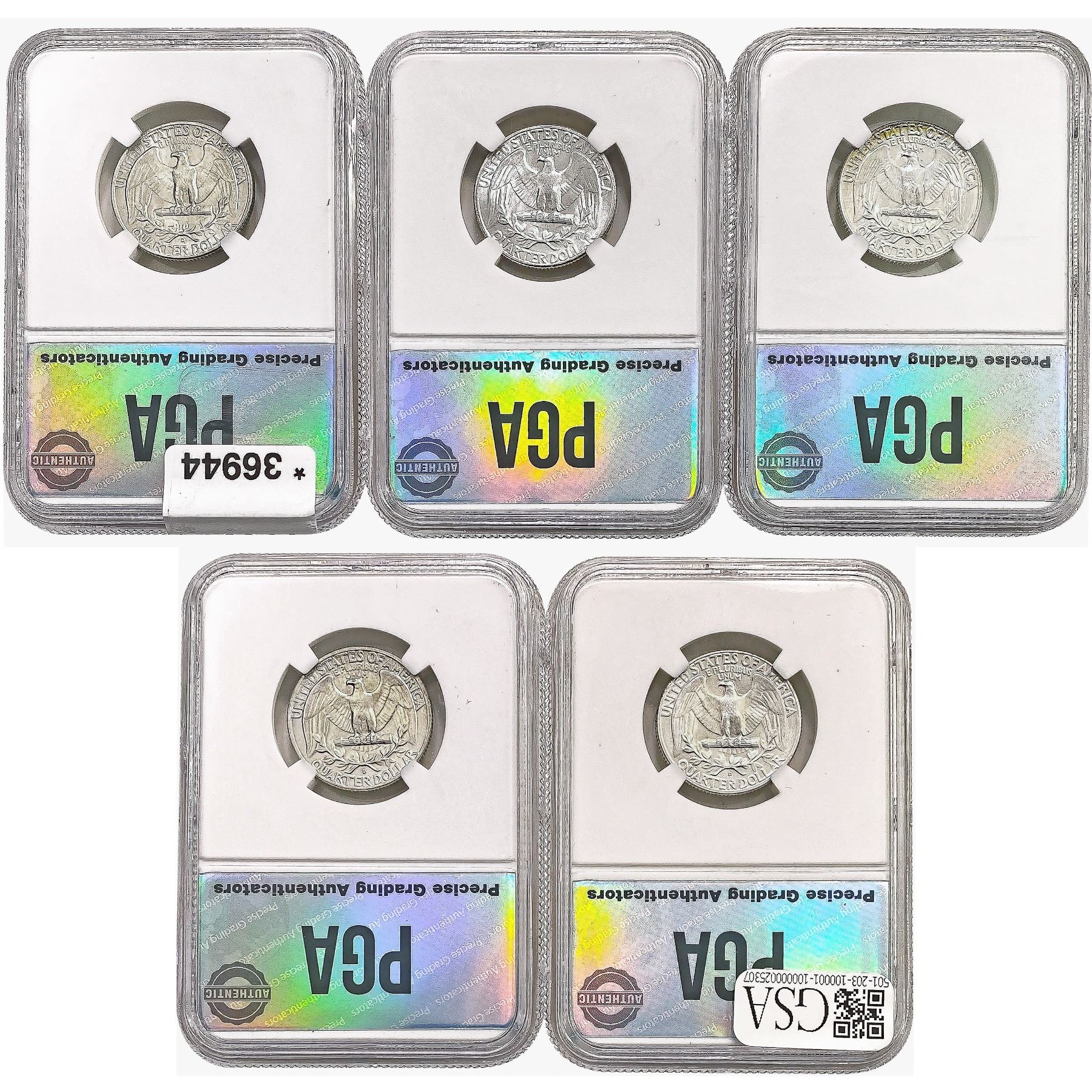 COINS AND CURRENCY LISTED IN GSA’S CATALOG AS GRADED AND ENCAPSULATED BY PCGS, NGC, ANACS, ICG, PCGS CURRENCY, PMG, PCGS BANKNOTE GRADING, CMC OR ANY OTHER THIRD-PARTY GRADING SERVICE ARE LIKEWISE SOLD “AS-IS” EXCEPT AS EXPRESSLY SET FORTH HEREIN. ALL THIRD-PARTY GRADING SERVICE GUARANTEES, INCLUDING AUTHENTICITY, ARE THE SOLE RESPONSIBILITY OF THE THIRD-PARTY GRADING SERVICE AND NOT WARRANTIES OR GUARANTEES OF GSA. BIDDERS SHOULD CONTACT THESE THIRD-PARTY GRADING SERVICES DIRECTLY WITH RESPECT TO ANY CLAIMS OR QUESTIONS THEY MAY HAVE CONCERNING THEIR GUARANTEES AND WARRANTIES. BIDDERS ACKNOWLEDGE AND AGREE THAT AUCTIONEER IS NOT BOUND BY OR LIABLE FOR ANY OPINION OR CERTIFICATION BY ANY THIRD-PARTY GRADING SERVICE. REMOVAL OF A PRODUCT FROM ITS PROTECTIVE CASING OR HOLDER OR ALTERATION OF ANY COIN HOLDER WAIVES ALL RIGHTS CONCERNING THE PRODUCT CONTAINED THEREIN.