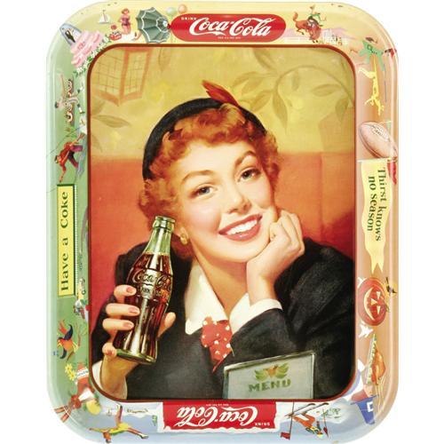 <B>1953-1960 Coca-Cola Menu Girl Tray,</B></I> 10.5" x 13.25". A fresh-faced and stylish damsel shines on this popular tray from the Eisenhower Era. The border is composed of small vignettes showing all manner of outdoor activities with a banner reading "Thirst Has No Season". The underside has minor abrasions from normal use while the top has only the slightest scuffs visible in angled light. Very fine condition.<BR><BR><b>Shipping:</b> Miscellaneous Collectibles, Larg (<a target="_blank" href="http://www.heritageauctions.com/common/shipping.php">view shipping information</a>)