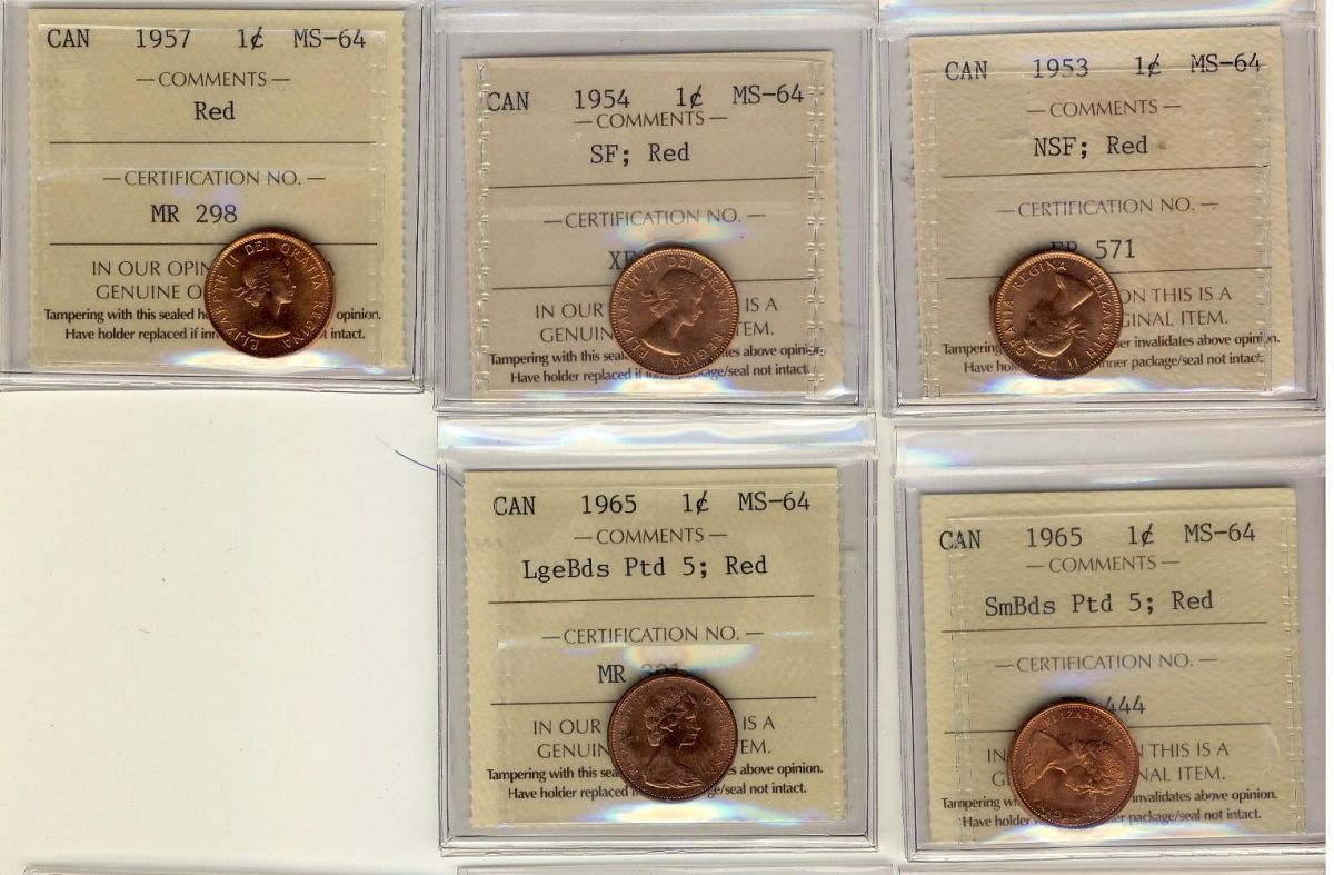 1953-1965 1¢ ICCS MS64RD. Lot of five coins, includes 1953 NSF, 1954 SF, 1957, 1965 SmBds Ptd 5 and 1965 LgBds Ptd 5. All coins Red.