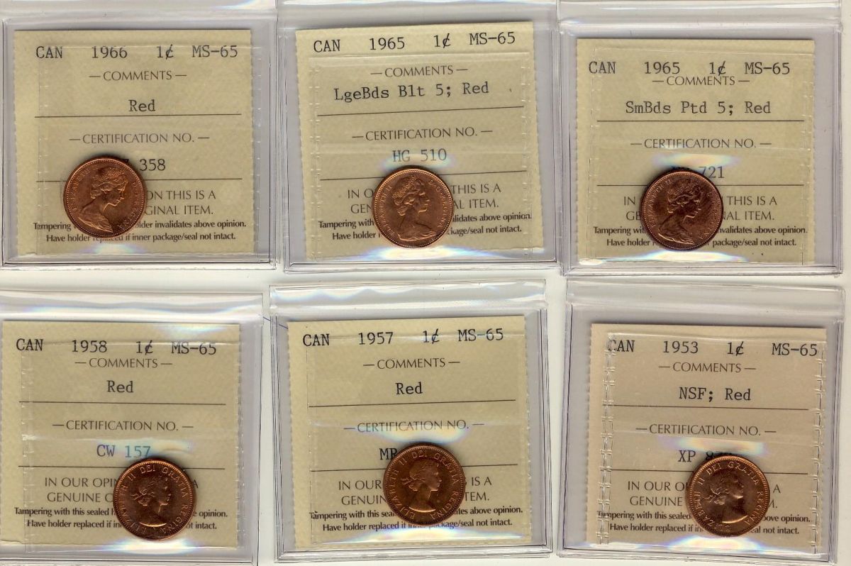 1953-1966 1¢ ICCS MS65RD. Lot of 6 coins including 1953 NSF, 1957. 1958, 1965 SmBds Ptd 5, 1965 LgBds Blt 5and 1966,