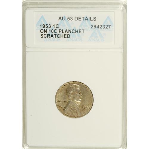 <B>1953 1C Lincoln Cent--On 10C Planchet, Scratched--ANACS. AU53 Details.</B></I> A well centered steel-gray wrong planchet error that has light wear on the cheekbone and jaw. Both sides have several thin scratches, presumably from the finder to determine if the piece was plated.<BR><BR><b>Shipping:</b> Coins & Currency (<a target="_blank" href="http://www.heritageauctions.com/common/shipping.php">view shipping information</a>)
