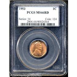 1953 1C MS66 Red PCGS. This fiery-red Superb Gem d <B>1953 1C MS66 Red PCGS.</B></I> This fiery-red Superb Gem does not reveal a single blemish that would cause one to question the validity of the assigned grade. Somewhat softly detailed on Lincoln's portrait, but fully lustrous and nearly pristine. <BR><BR><B>Important notice:</B> Heritage usually auctions material at the rate of 200-250 lots per hour. On some occasions eBay Live bid software or the Internet may not be able to keep up with the pace of the auction. We recommend placing a realistic absentee bid now as insurance to avoid disappointment. Occasionally the auctioneer may eliminate or reject an eBay Live bid, and the auctioneer may also reopen a lot after the close of the eBay live bidding (usually because we missed an audience bid), and may reject your bid even if it shows you as the winning bidder. By bidding via eBay Live, you agree that Heritage may award the lot to another bidder at its sole discretion under the circumstances described above or any other reasonable circumstances. Since eBay bids are not shown to us until we open the lot on the floor, we treat those bids just like floor bids. In most cases the floor responds before the eBay bid is presented to us, due to Internet lag time, so for consistency we have made it a policy that floor bids are always considered first over tie eBay live bids. Also please note that all Heritage lots purchased through eBay Live carry a 20% Buyer's Premium. Please make sure you read the Terms and Conditions before you bid. This lot is being auctioned in conjunction with a live floor auction by Heritage Galleries & Auctioneers. All final auction and invoice information will be supplied by Heritage Galleries & Auctioneers, and all other information should be considered preliminary. Lot:5381