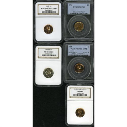 <B>1953 1C PR67 Red PCGS; 1958 PR67 Red Cameo PCGS; 1960 Large Date PR69 Red NGC; 1963 PR69 Red Deep Cameo NGC;</B></I> and a <B>1965 Nickel SMS MS67 Cameo NGC.</B></I><BR><BR><b>Shipping:</b> Coin/Currency (<a target="_blank" href="http://www.heritageauctions.com/common/shipping.php">view shipping information</a>)