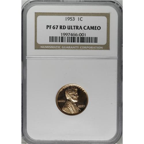 <B>1953 1C PR67 Red Ultra Cameo NGC.</B></I> Fantastic field-motif contrast jumps out at the viewer, and copper-orange color adorns both surfaces which present an orange-on-black appearance when the coin is viewed from directly overhead. An exquisite strike characterizes the design features, and both faces are immaculately preserved. Census: 2 in 67 Red Ultra Cameo, 1 finer (12/06).<BR><BR><b>Shipping:</b> Coin/Currency (<a target="_blank" href="http://www.heritageauctions.com/common/shipping.php">view shipping information</a>)