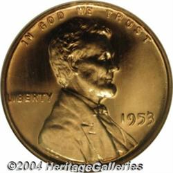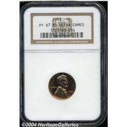 <B>1953<1C> PR67 Red Ultra Cameo NGC.</B></I> An unsurpassable strike and splendid red-orange color highlight this immaculate Superb Gem. Untoned with highly-reflective fields, and mild cameo contrast is seen, more notably on the reverse. A seemingly unimprovable specimen. <BR><BR><B>Important notice:</B> Heritage usually auctions material at the rate of 200-250 lots per hour. On some occasions eBay Live bid software or the Internet may not be able to keep up with the pace of the auction. We recommend placing a realistic absentee bid now as insurance to avoid disappointment. Occasionally the auctioneer may eliminate or reject an eBay Live bid, and the auctioneer may also reopen a lot after the close of the eBay live bidding (usually because we missed an audience bid), and may reject your bid even if it shows you as the winning bidder. By bidding via eBay Live, you agree that Heritage may award the lot to another bidder at its sole discretion under the circumstances described above or any other reasonable circumstances. Since eBay bids are not shown to us until we open the lot on the floor, we treat those bids just like floor bids. In most cases the floor responds before the eBay bid is presented to us, due to Internet lag time, so for consistency we have made it a policy that floor bids are always considered first over tie eBay live bids. Also please note that all Heritage lots purchased through eBay Live carry a 20% Buyer's Premium. Please make sure you read the Terms and Conditions before you bid. </span></font></tr></table></td></tr></table>