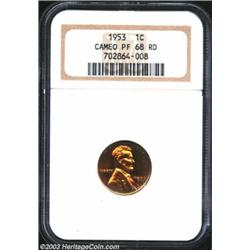 1953 1C PR68 Cameo NGC. An unsurpassable strike and splendid red-orange color highlight this immaculate Superb Gem. A light, misty haze rests upon the highly-reflective fields, and mild cameo contrast is seen, more notably on the reverse. A seemingly unimprovable specimen. Important notice: We expect to be auctioning lots at the rate of 200-250 per hour. On occasion eBay live bid software cannot keep up with the pace of the auctions where 4-5 lots per minute can hammer down, so we recommend that you place a realistic absentee bid now as insurance to avoid disappointment. Also please note that all Heritage/CAA lots purchased through eBay Live carry a 20% Buyer's Premium. Please make sure you read the Terms and Conditions.