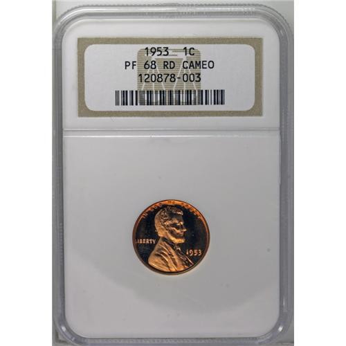 <B>1953<1C> PR68 Red Cameo NGC.</B></I> A thoroughly original piece with pleasing contrast and great luster. This remarkable example is a recent addition to the <I>Census.</B></I>