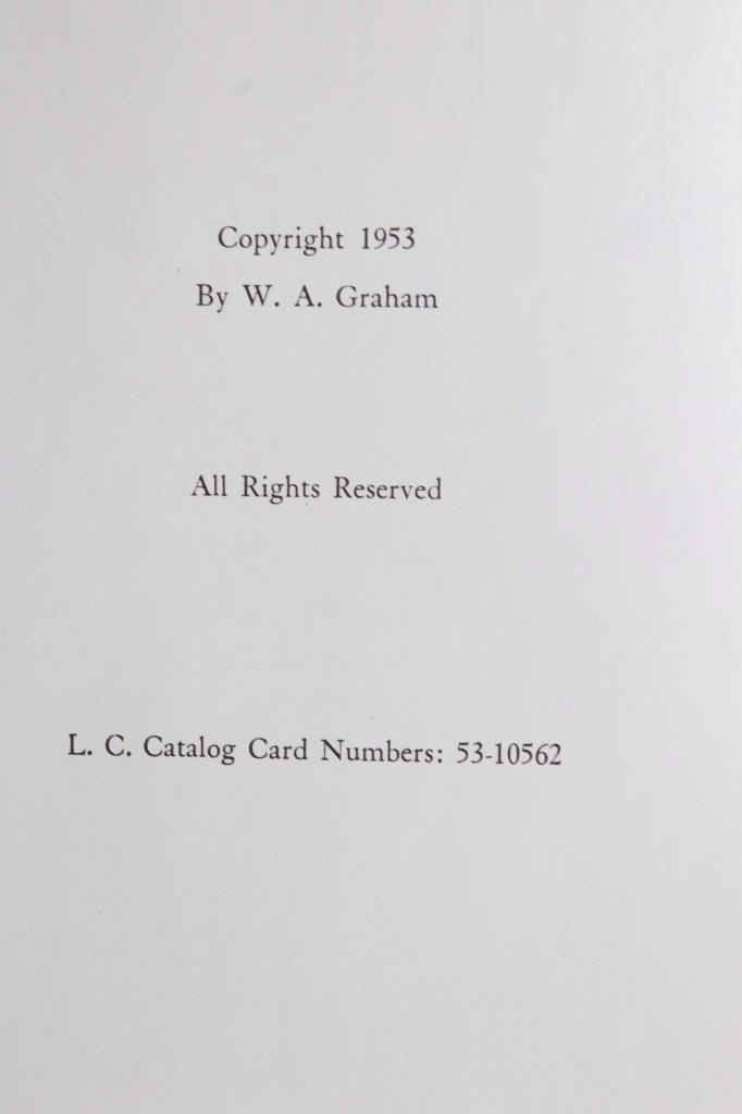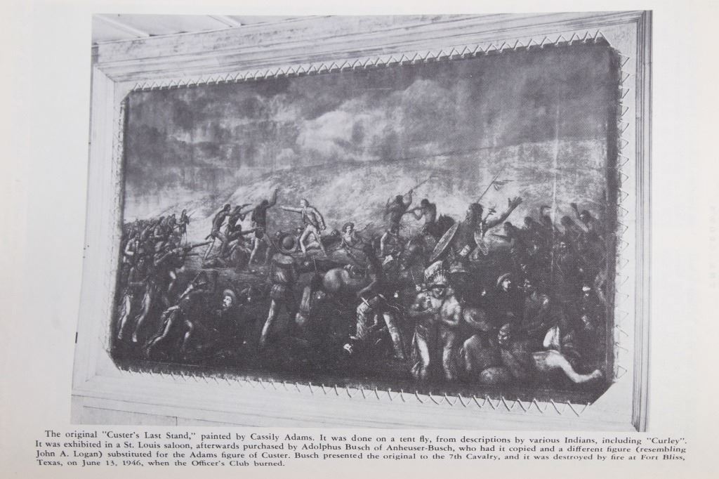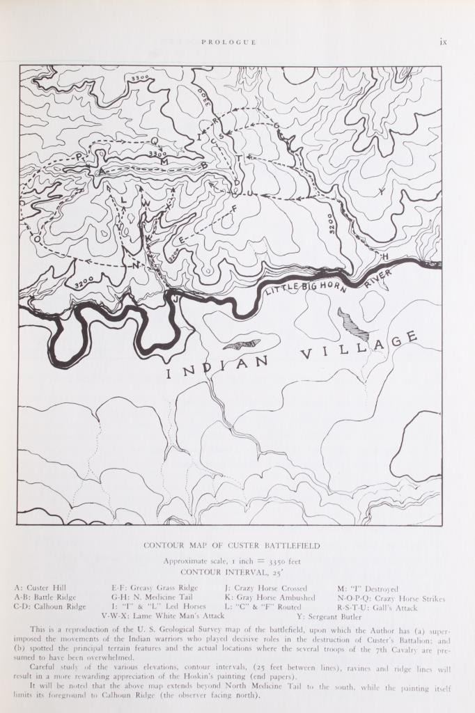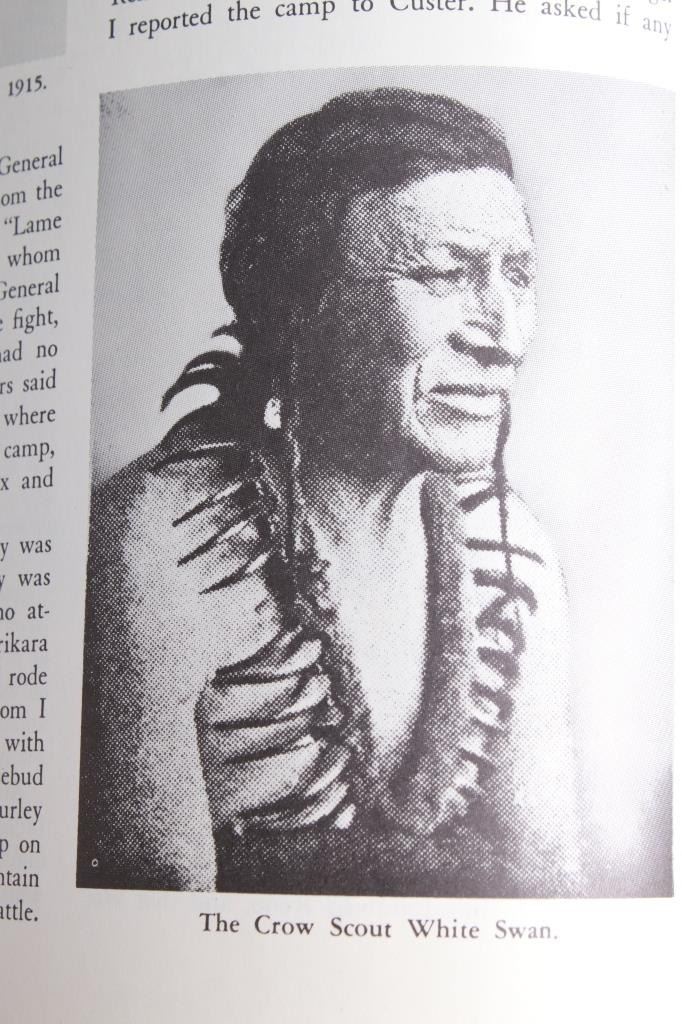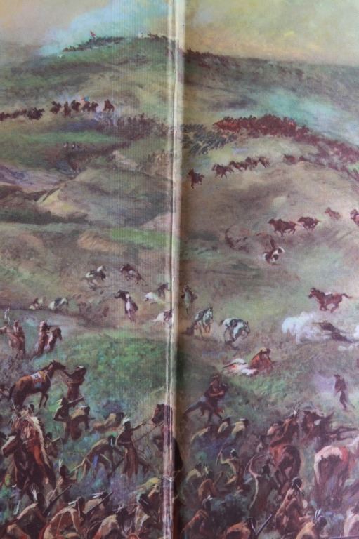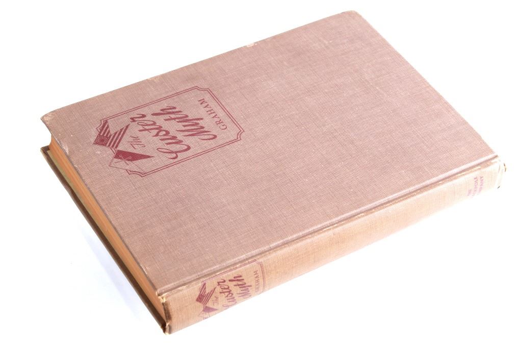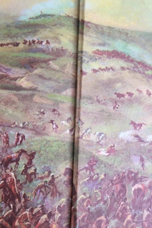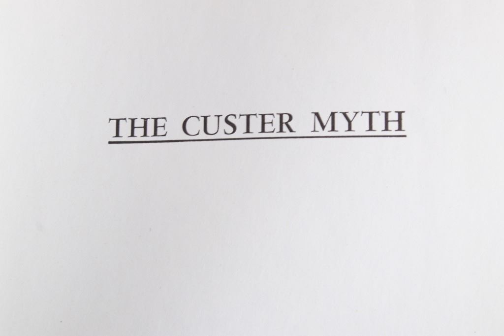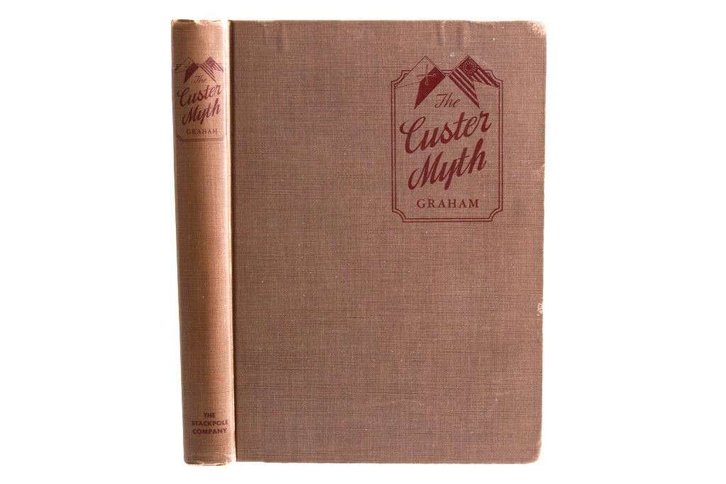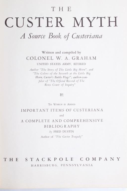 Featured in this lot is this 1953 first edition of “The Custer Myth” by Col Graham. This book includes important items of Custeriana and a complete and comprehensive bibliography by Fred Dustin. The book is bound on tan cloth with red embossing on the cover and spine. The front and back-end papers show a full color printing of a painting by Gayle P. Hoskins. Working from a clay model of the battlefield with a U.S.G.S. contour map and a troop movement map, this is a unique view of the battle. One of the interesting things brought to light in this book is how the U.S. Cavalry companies rode horses of matching colors. The condition of this book is good, with slight wear to the cover and spine consistent with the age of this book. The measurements of this book are 10 1/2" x 8".