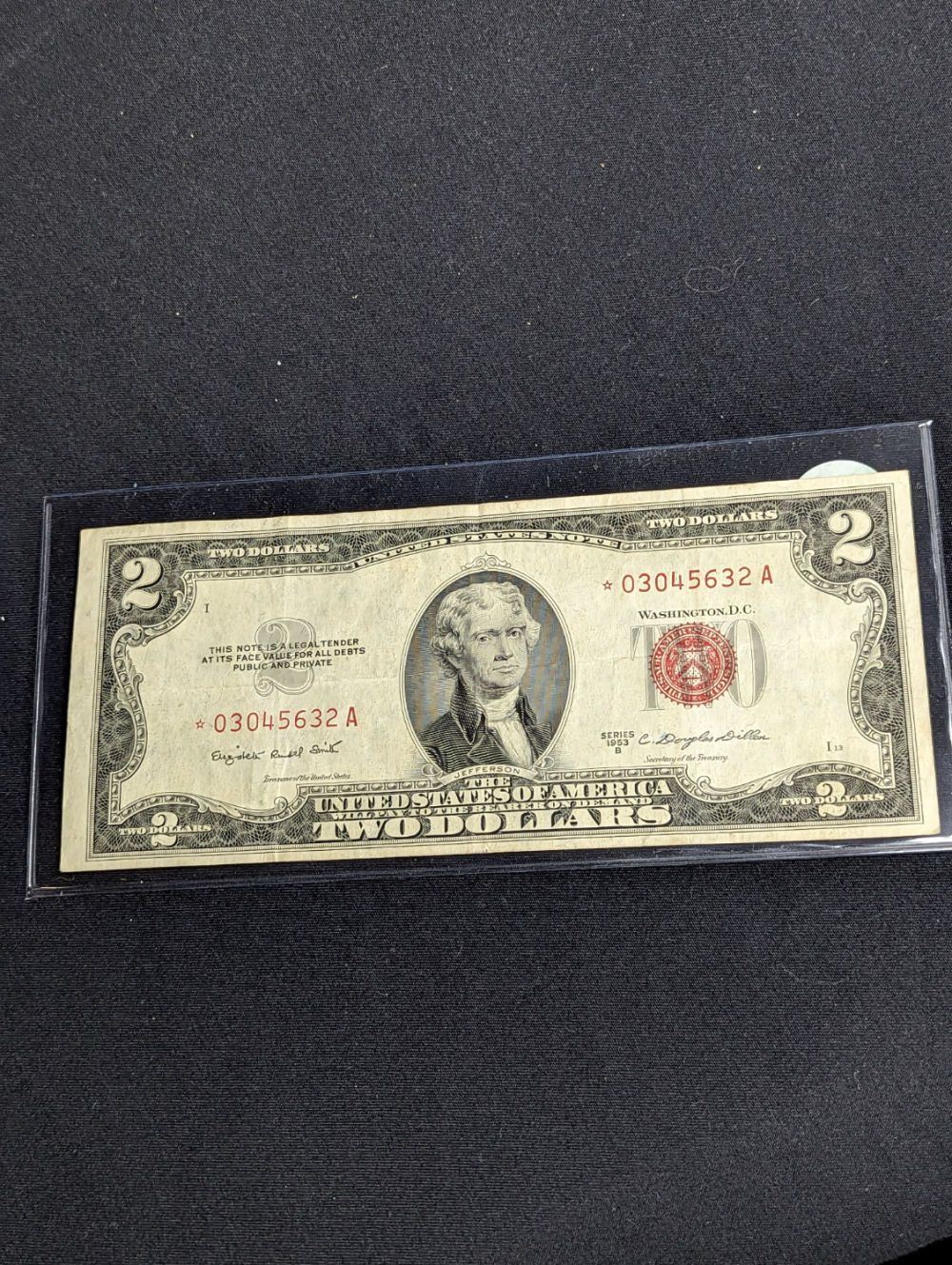 A 1953 $2 Dollar Red Seal Star Note in choice AU condition. Just some slight folds on this popular $2.00 red seal star note.