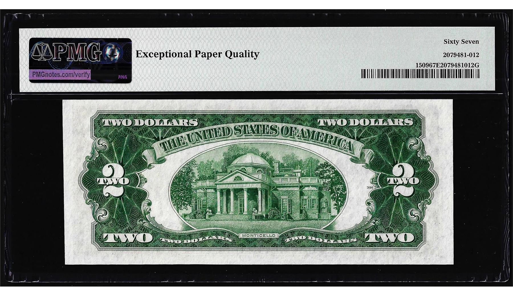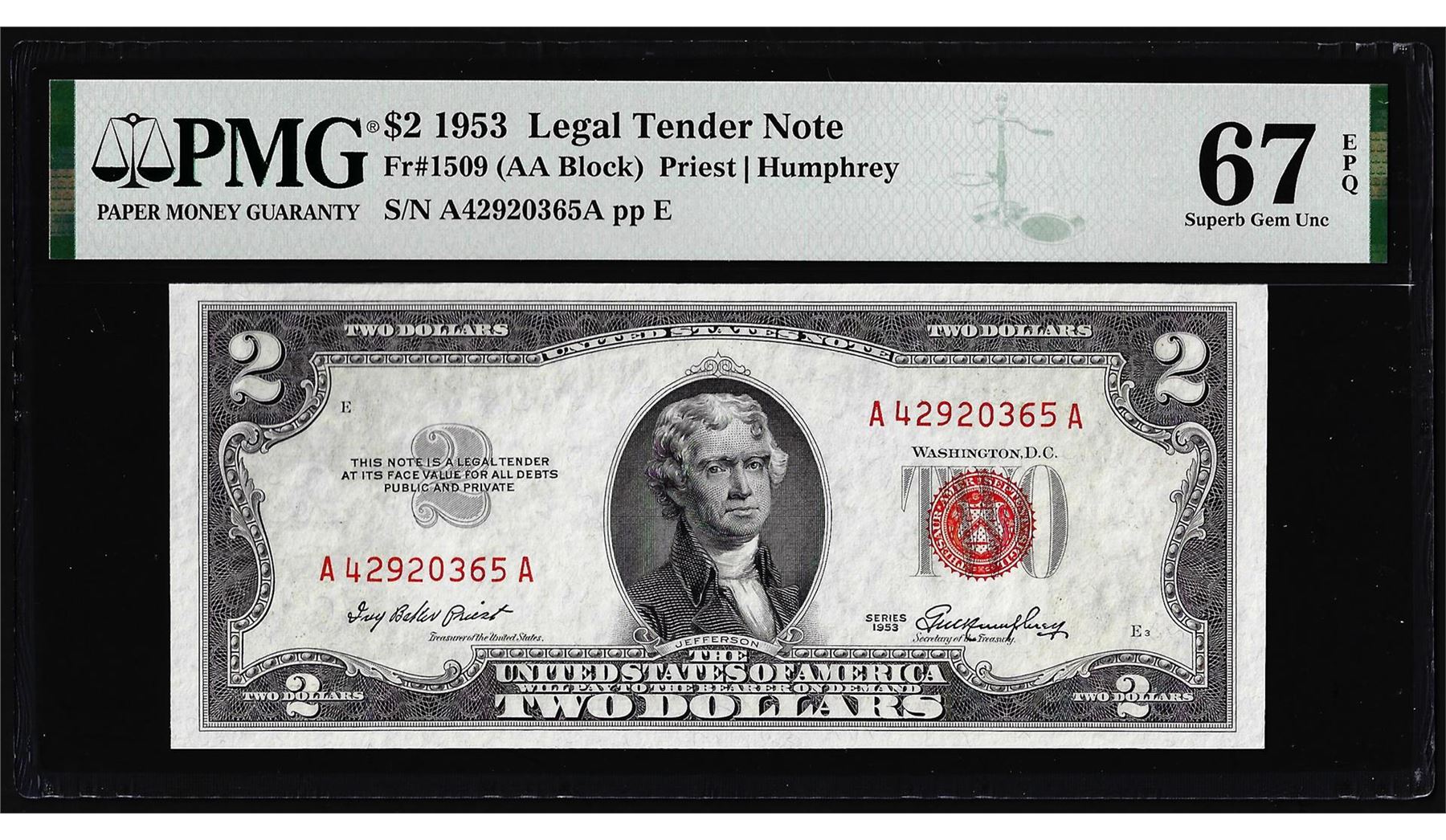 One 1953 $2 Legal Tender Note Fr.1509 PMG Superb Gem Uncirculated 67EPQ. PMG Certified.