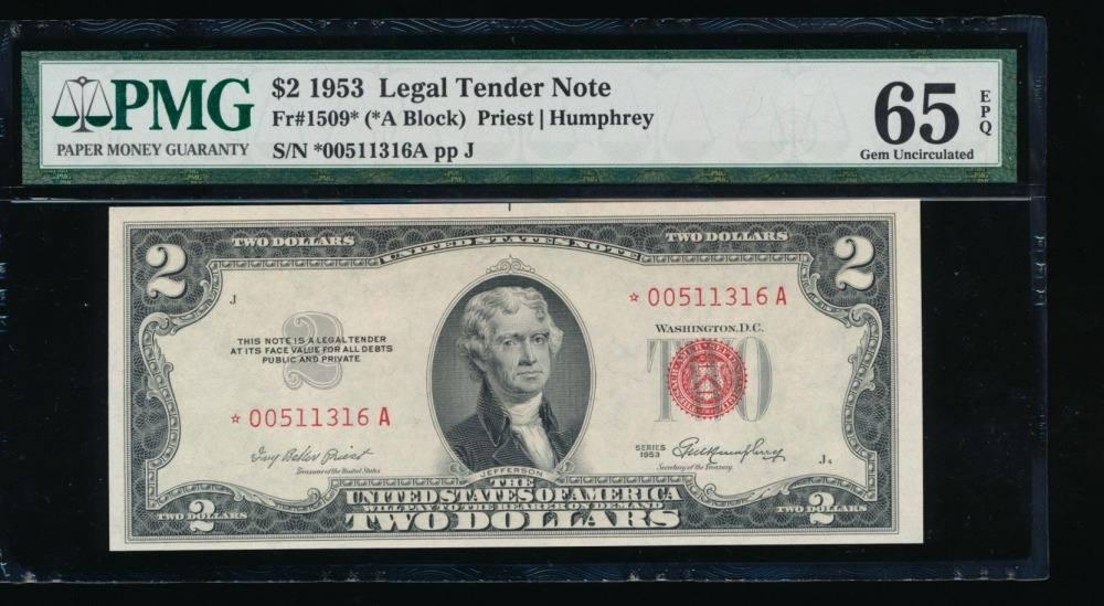 One 1953 $2 Legal Tender STAR Note PMG 65EPQ.