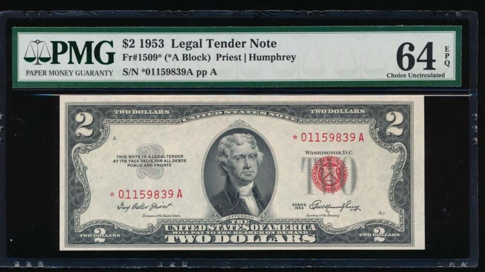 One 1953 $2 Legal Tender Star Note PMG 64EPQ.