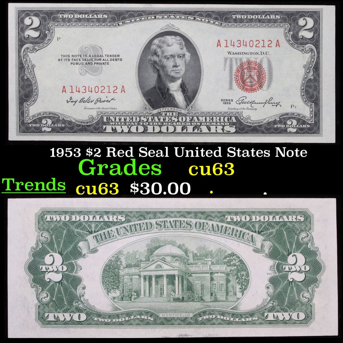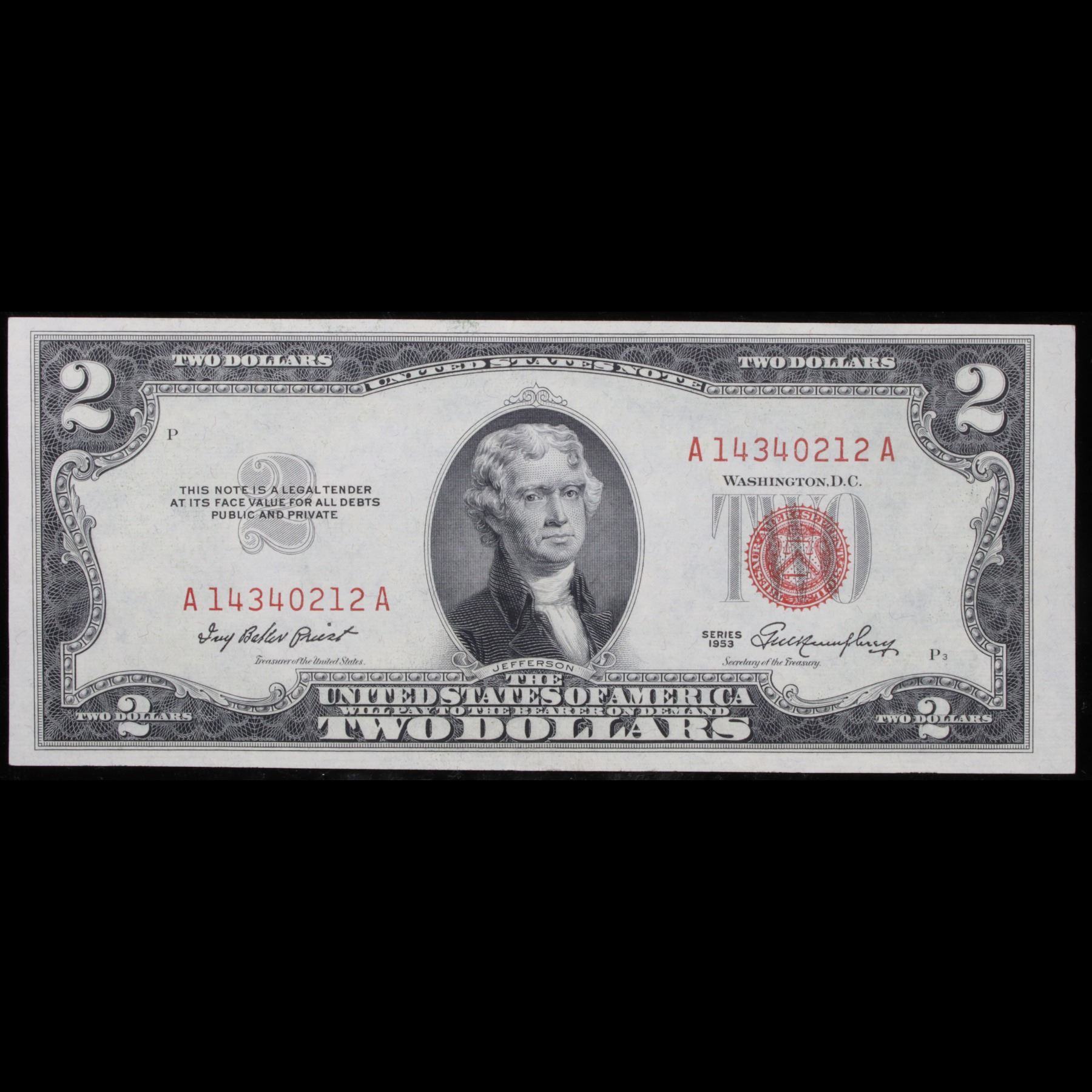 1953 $2 Red Seal United States Note Grades Select CU. 1953 red print two dollar bills can be broke up into four different types by signature combination; 1953 Ð Ivy Baker Priest (Treasurer of The United States) and G.M. Humphrey (Secretary of the Treasury), 1953A Ð Ivy Baker Priest and Robert B Anderson, 1953B Ð Elizabeth Rudel Smith and C. Douglas Dillon, 1953C Ð Kathryn OÕHay Granahan and C. Douglas Dillon. 1953 two dollar bills feature Thomas Jefferson as the central figure. The back of the bill shows Monticello. These were printed in Washington DC and circulated across the country. They have red overprints and a red seal on the right hand side of the bill. You can find the following phrases on the bill: ÒTwo Dollars, United States Note, The United States of America will pay to the bearer on demand Two DollarsÓ ÒThis note is a legal tender at its face value for all debts public and privateÓ