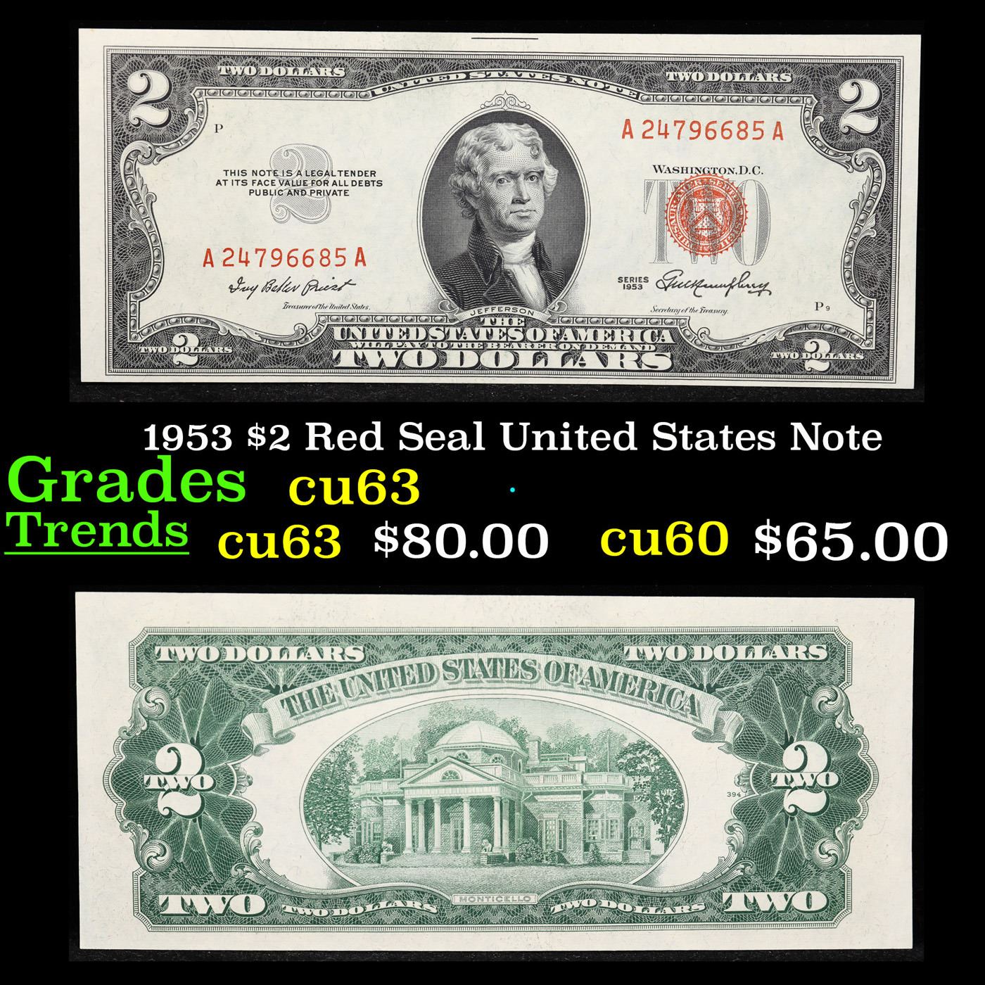 1953 $2 Red Seal United States Note Grades Select CU. 1953 red print two dollar bills can be broke up into four different types by signature combination; 1953 – Ivy Baker Priest (Treasurer of The United States) and G.M. Humphrey (Secretary of the Treasury), 1953A – Ivy Baker Priest and Robert B Anderson, 1953B – Elizabeth Rudel Smith and C. Douglas Dillon, 1953C – Kathryn O’Hay Granahan and C. Douglas Dillon. 1953 two dollar bills feature Thomas Jefferson as the central figure. The back of the bill shows Monticello. These were printed in Washington DC and circulated across the country. They have red overprints and a red seal on the right hand side of the bill. You can find the following phrases on the bill: “Two Dollars, United States Note, The United States of America will pay to the bearer on demand Two Dollars” “This note is a legal tender at its face value for all debts public and private”