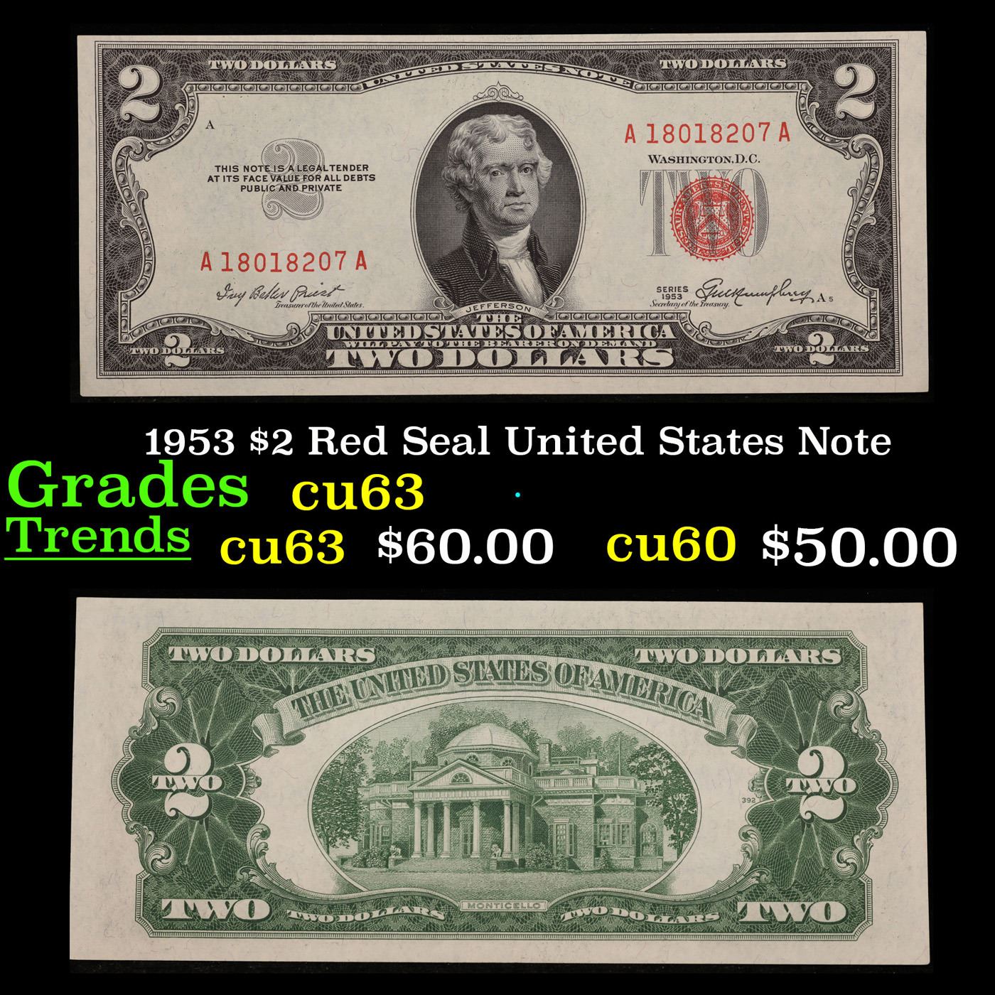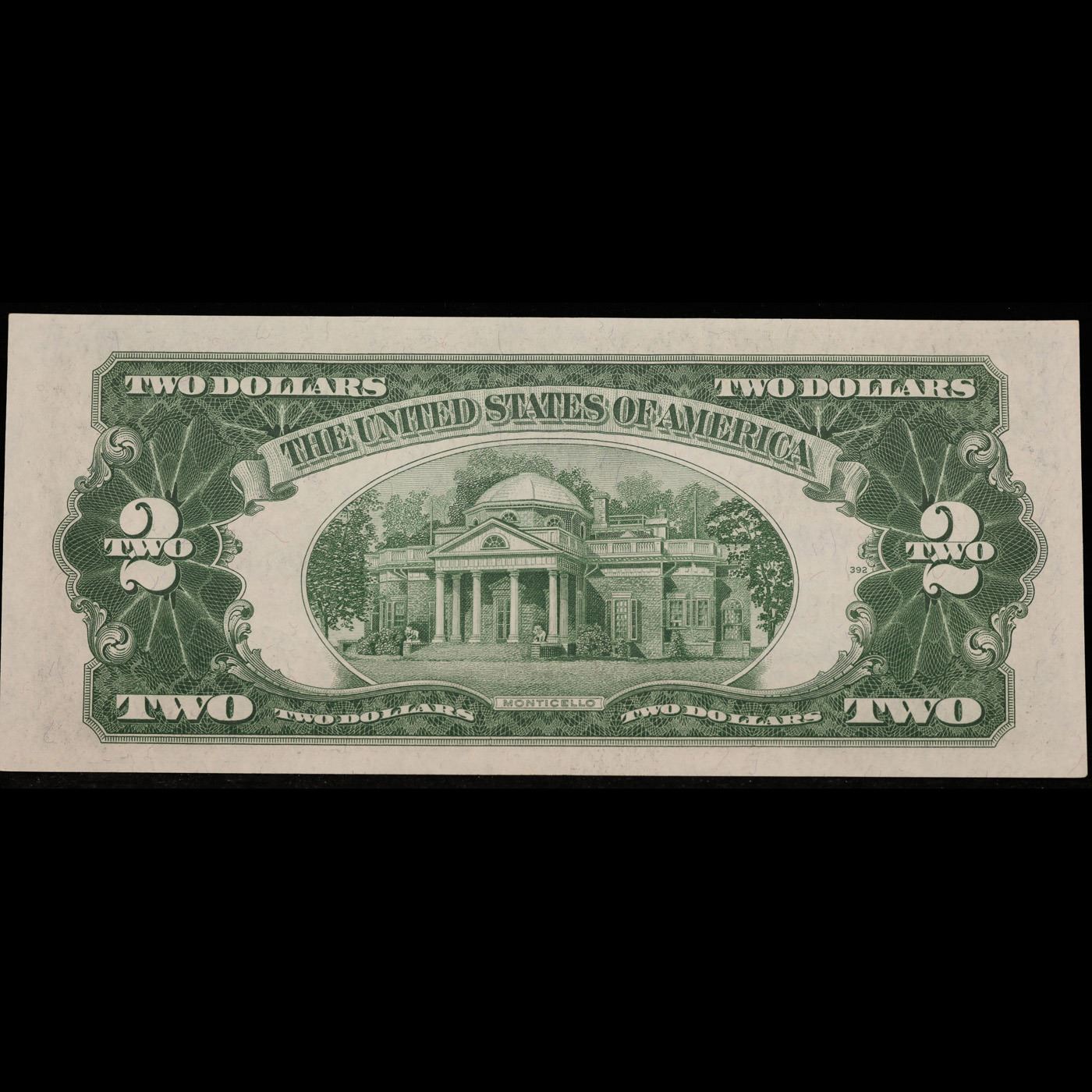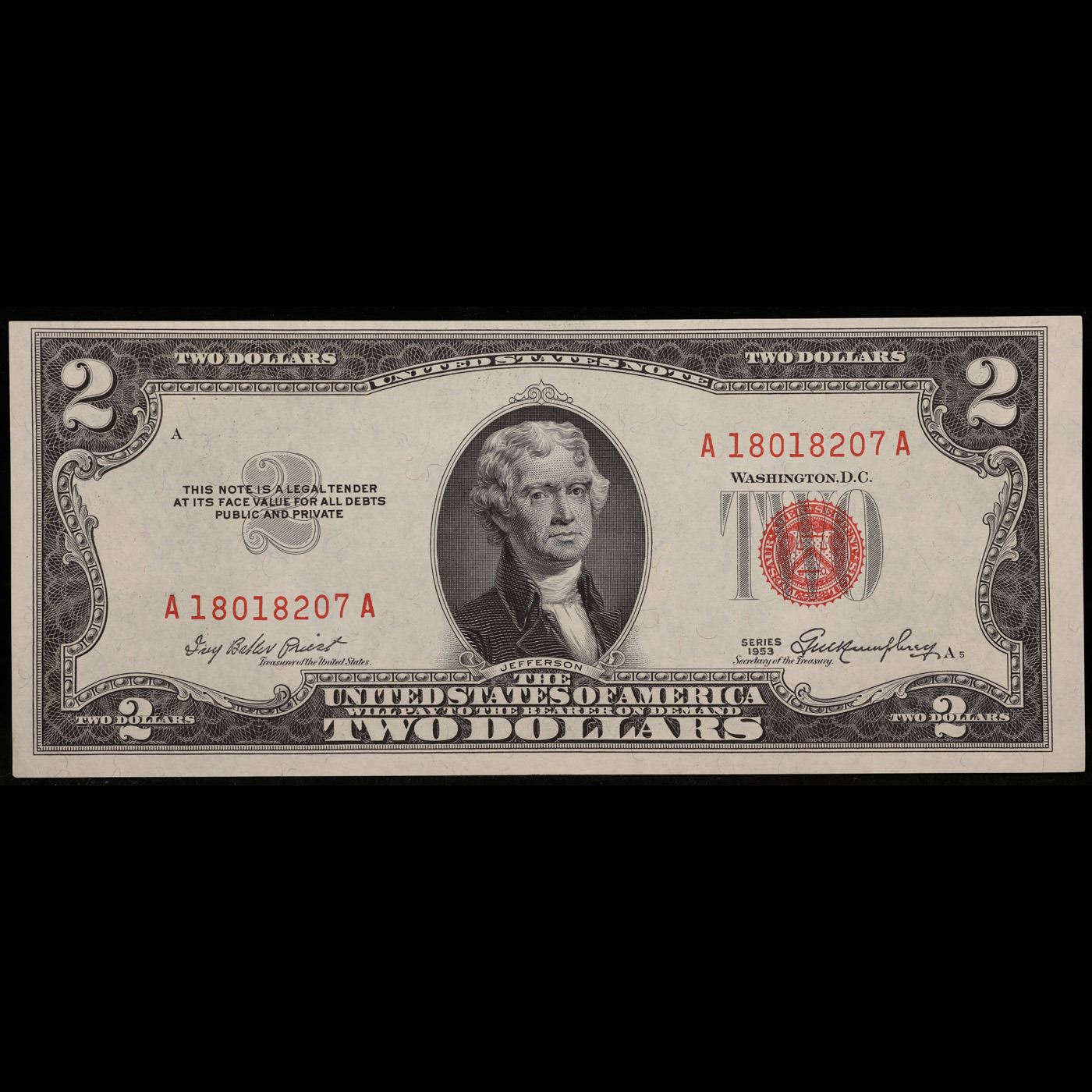 1953 $2 Red Seal United States Note Grades Select CU. 1953 red print two dollar bills can be broke up into four different types by signature combination; 1953 – Ivy Baker Priest (Treasurer of The United States) and G.M. Humphrey (Secretary of the Treasury), 1953A – Ivy Baker Priest and Robert B Anderson, 1953B – Elizabeth Rudel Smith and C. Douglas Dillon, 1953C – Kathryn O’Hay Granahan and C. Douglas Dillon. 1953 two dollar bills feature Thomas Jefferson as the central figure. The back of the bill shows Monticello. These were printed in Washington DC and circulated across the country. They have red overprints and a red seal on the right hand side of the bill. You can find the following phrases on the bill: “Two Dollars, United States Note, The United States of America will pay to the bearer on demand Two Dollars” “This note is a legal tender at its face value for all debts public and private”