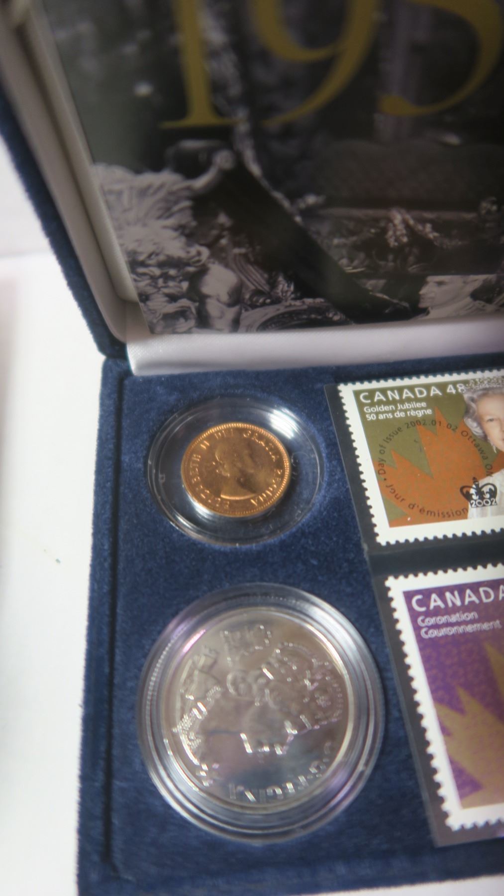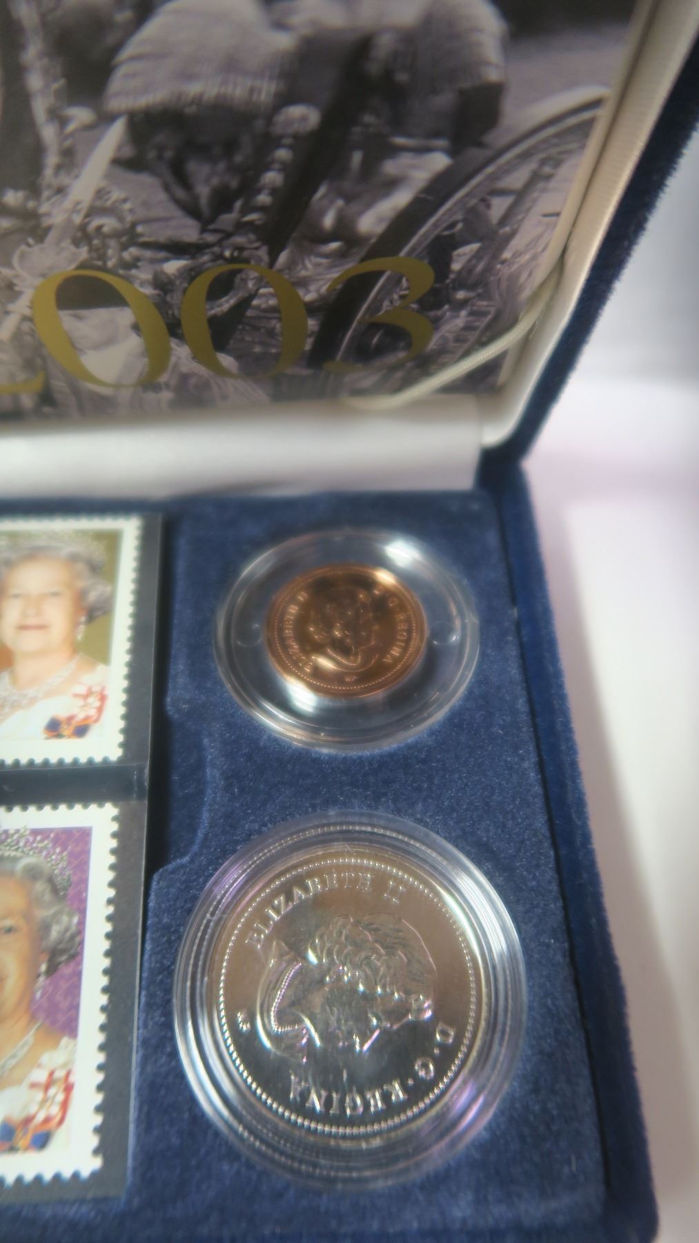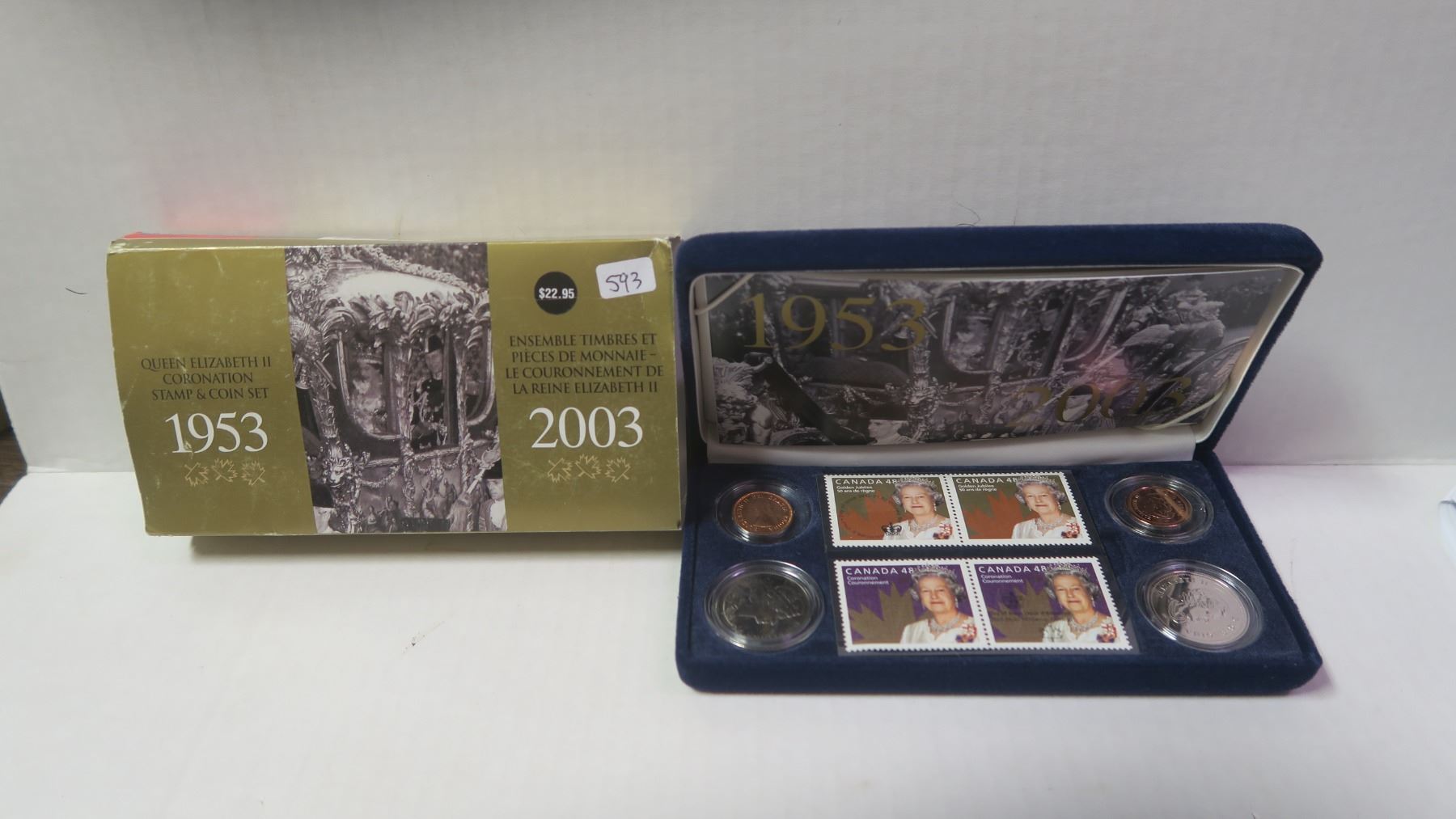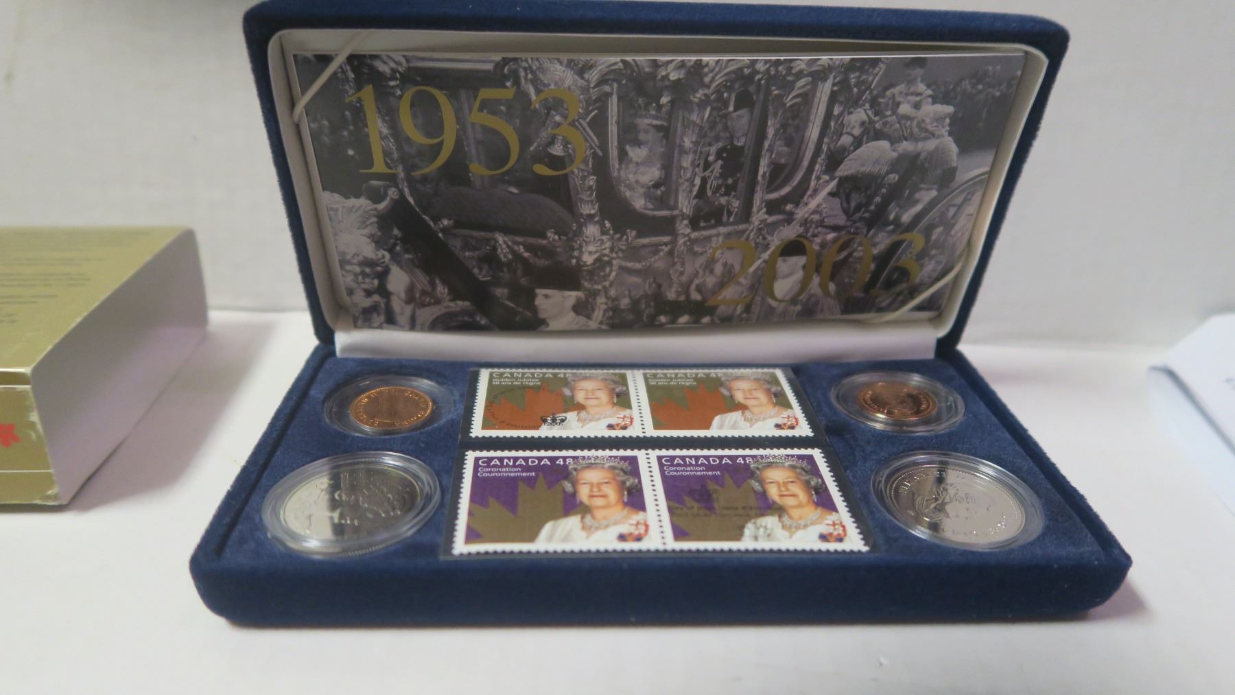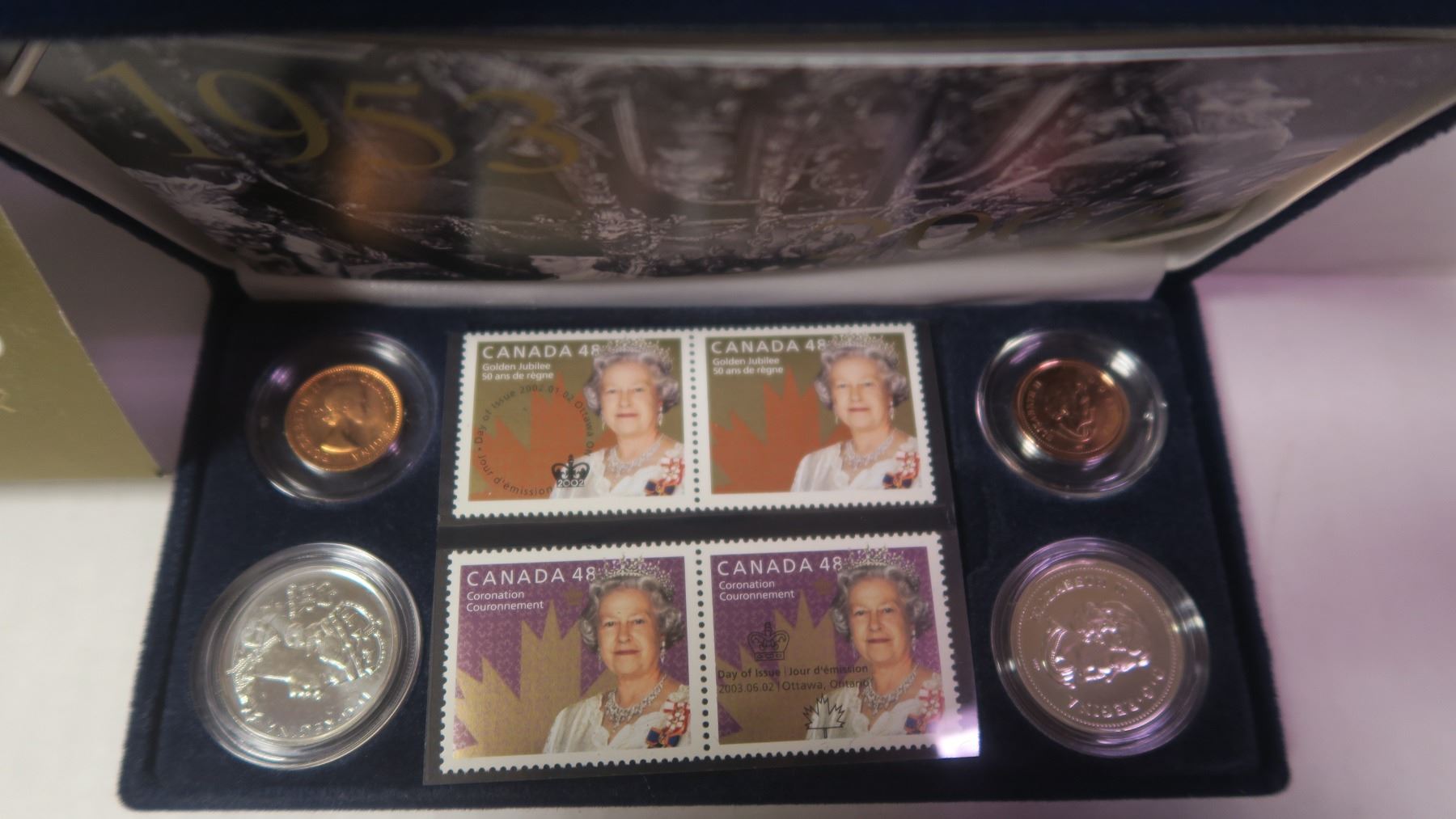 1953 – 2003 Queen Elizabeth II Coronation Stamp & Coin Set. Includes 4 coins and 4 Mint Stamps. Housed in its original case of issue.