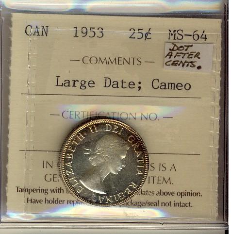 1953 25¢ Large Date ICCS MS64 Cameo Dot after Cents