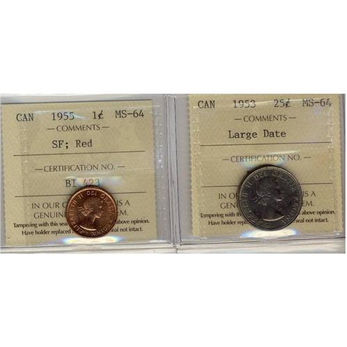 1953 25¢ SF & 1955 1¢ SF. Lot of two coins both ICCS MS64. The 1955 1¢ is Full red