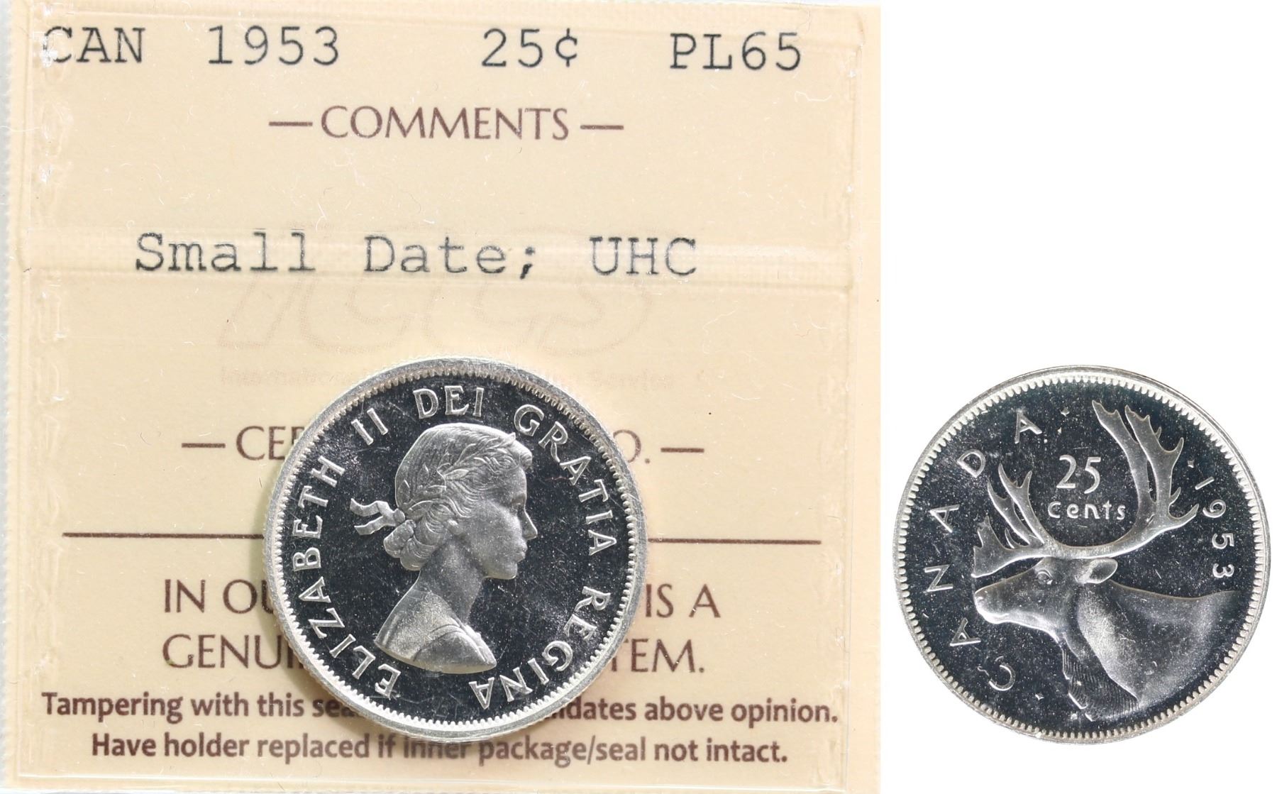 1953 25¢ "Small Date" ICCS Gem Proof-Like-65, Fully brilliant with superb fields and reflective surfaces.