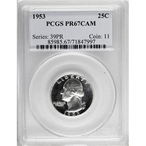 <B>1953 25C PR67 Cameo PCGS.</B></I> PCGS Population (163/30). NGC Census: (220/184). Numismedia Wsl. Price for NGC/PCGS coin in PR67: $140. (#85985)<BR><BR><b>Shipping:</b> Coins & Currency (<a target="_blank" href="http://www.heritageauctions.com/common/shipping.php">view shipping information</a>\)